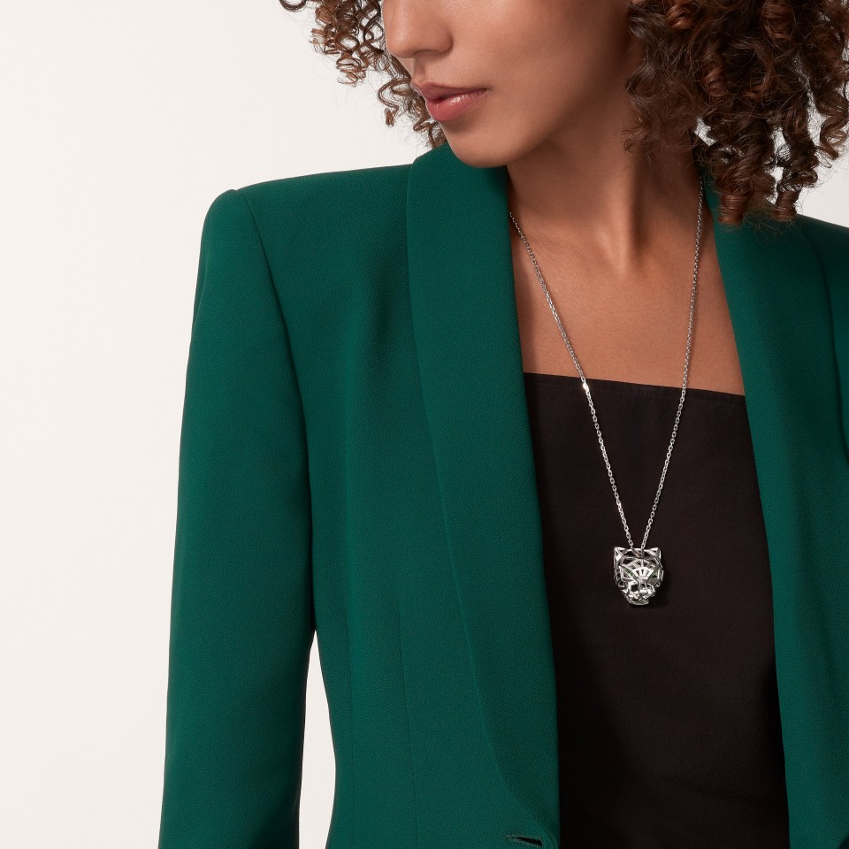 Panthère de Cartier necklace, 18K white gold (750/1000), set with emeralds, onyx and 347 brilliant-cut diamonds totaling 0.93 carat. Length: 65.7cm. Width of the motif: 27.2 mm. Thickness of the motif: 17.13 mm. Length of the motif: 30.3 mm.