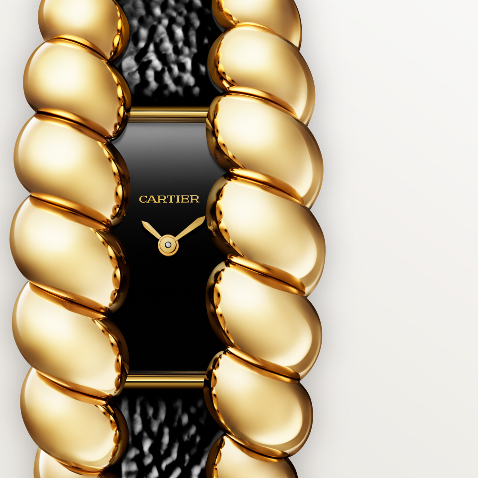 Tressage watch, quartz movement. 18K yellow gold (750/1000) case. Black lacquer dial, polished steel sword-shaped hands with golden-finish, sapphire crystal. Shiny black leather strap, second strap in smooth black leather, 18K yellow gold (750/1000) ardillon buckle. Case dimensions: 56.2 x 25.7 mm, thickness: 11.5 mm. Water-resistant up to 3 bar (approx. 30 meters/100 feet).