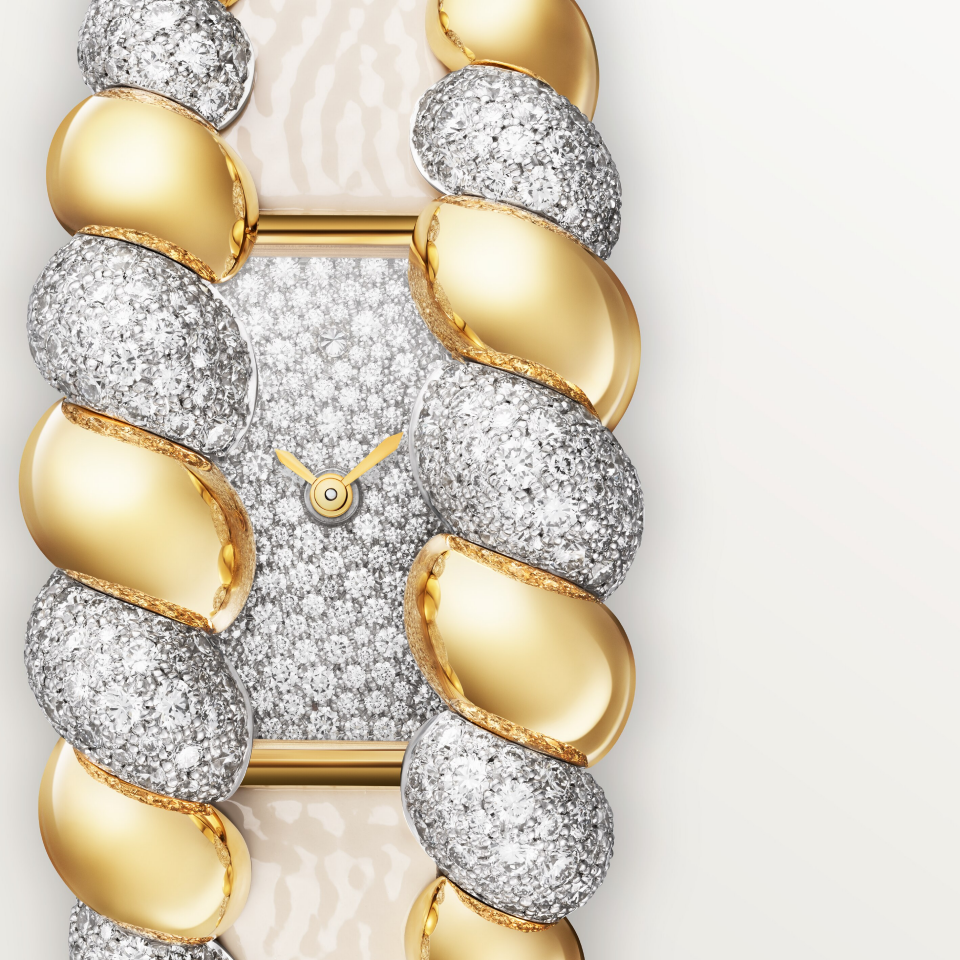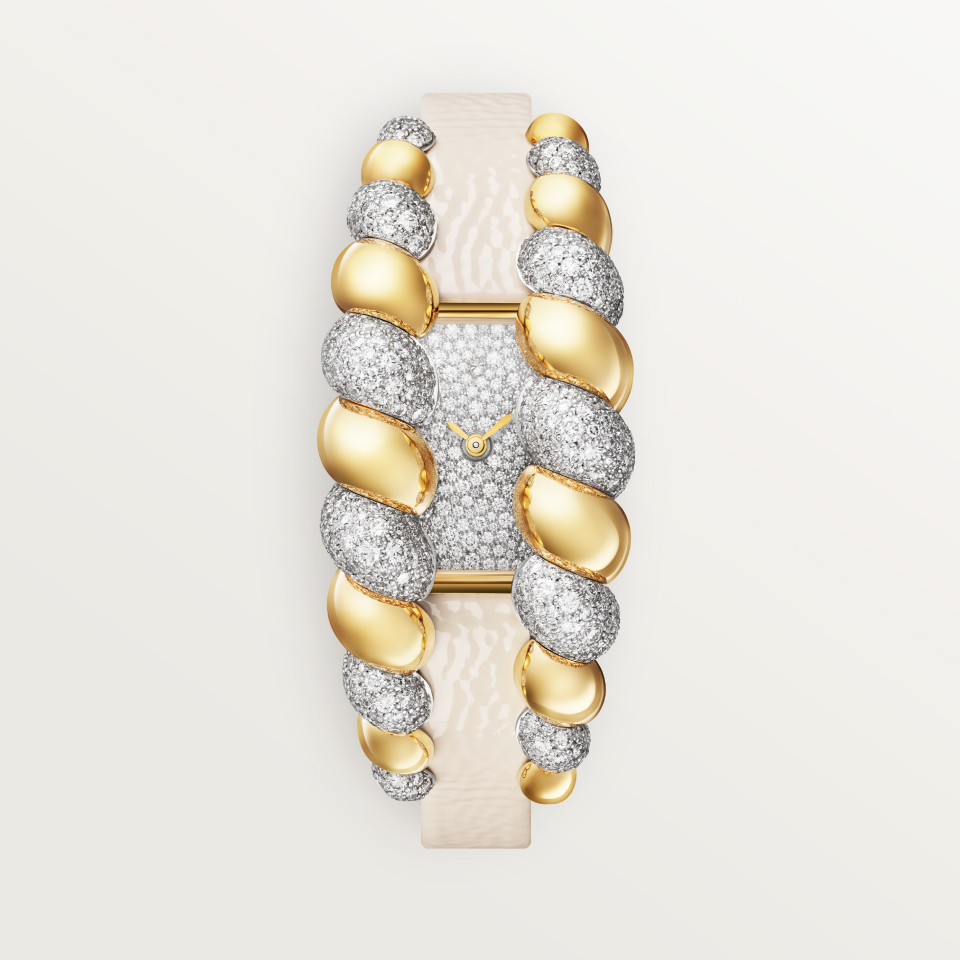 Tressage watch, quartz movement. 18K yellow gold (750/1000) case set with 622 brilliant-cut diamonds totaling 6.9 carats. Rhodiumized 18K white gold (750/1000) dial set with brilliant-cut diamonds, polished steel sword-shaped hands with golden-finish, sapphire crystal. Shiny beige leather strap, second strap in smooth black leather, 18K yellow gold (750/1000) ardillon buckle in set with brilliant-cut diamonds. Case dimensions: 56.2 x 25.7 mm, thickness: 11.5 mm. Water-resistant up to 3 bar (approx. 30 meters/100 feet).