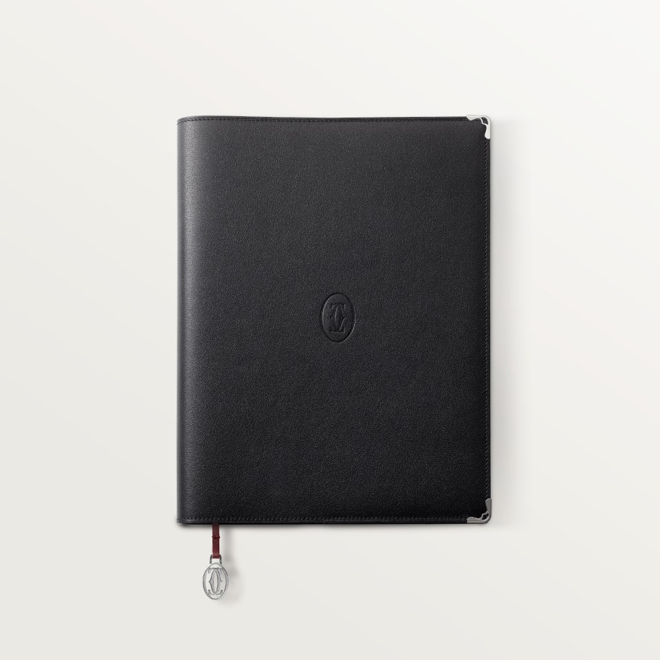 Must de Cartier black calfskin desk diary. Exterior: embossed double C logo, stainless steel metallic-finished corners Interior: burgundy calfskin, silver "Cartier" marking. The diary cover is sold with a refill. Dimensions: height 235 mm x width 175 mm.