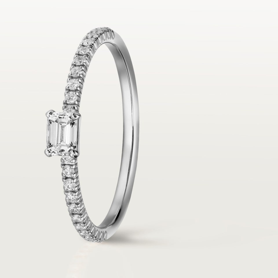 Étincelle de Cartier ring, 18K white gold (750/1000), set with an emerald-cut diamond center stone of 0.16 carat and 22 brilliant-cut diamonds totaling 0.10 carat. Width: 1.52 mm. Thickness: 1.35 mm (for size 52).