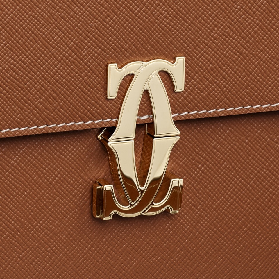 Mini model shoulder bag in caramel textured calfskin, golden-finish clasp, golden hot-stamped “Cartier” signature on the inside. Three inside compartments, one flat pocket and one signature pocket with removable mirror. Lining: black lambskin. Dimensions: length 190 mm x height 160 mm x depth 70 mm. Shoulder and cross-body carry.