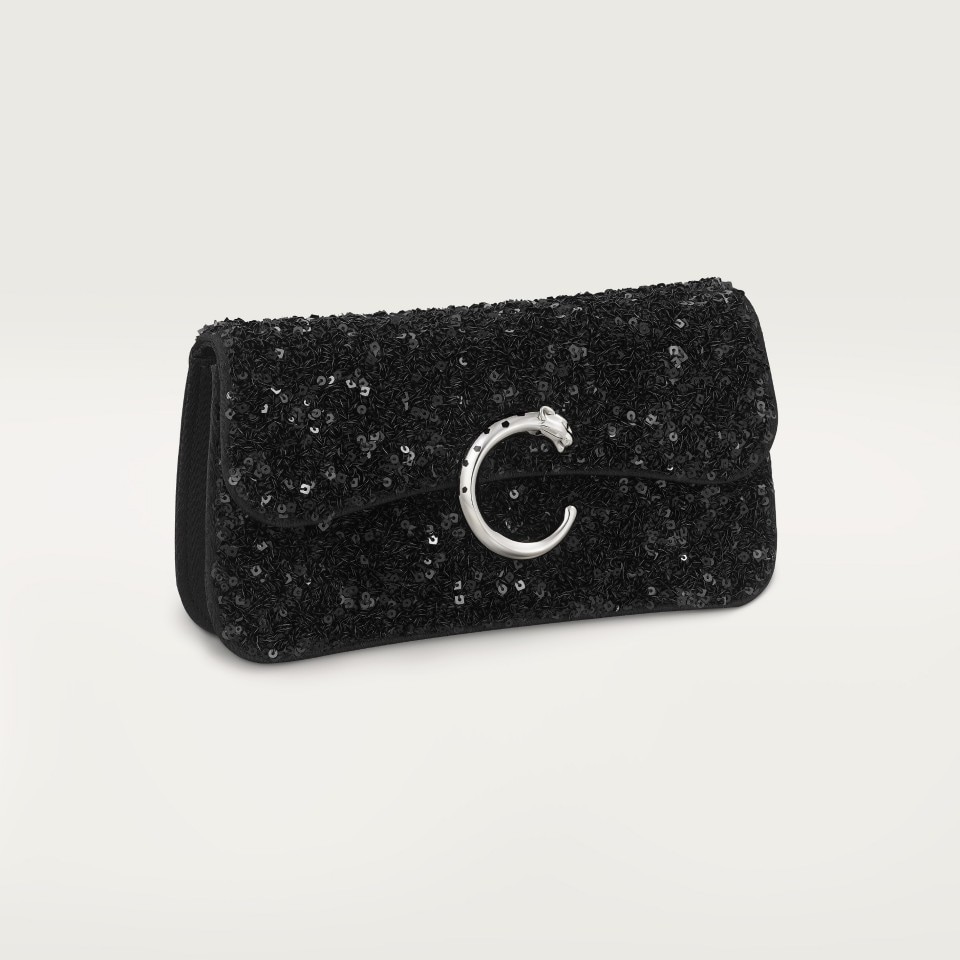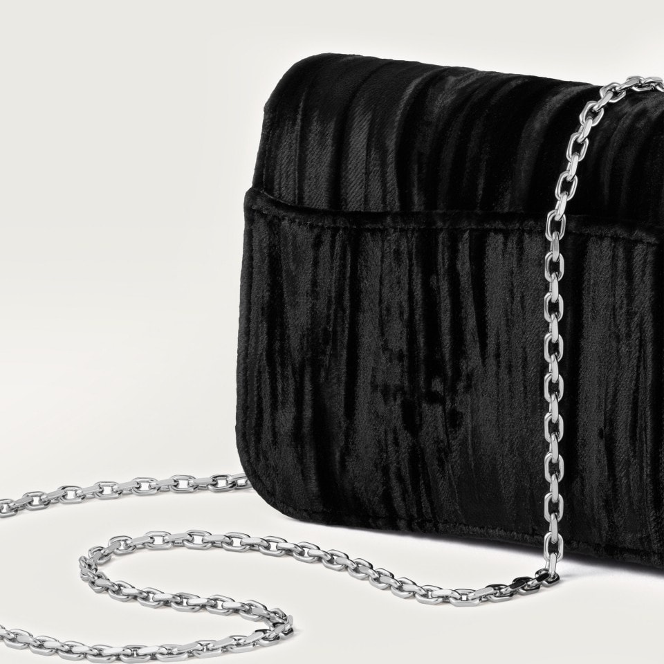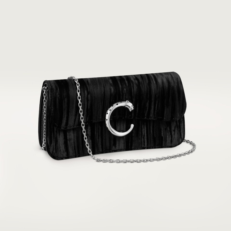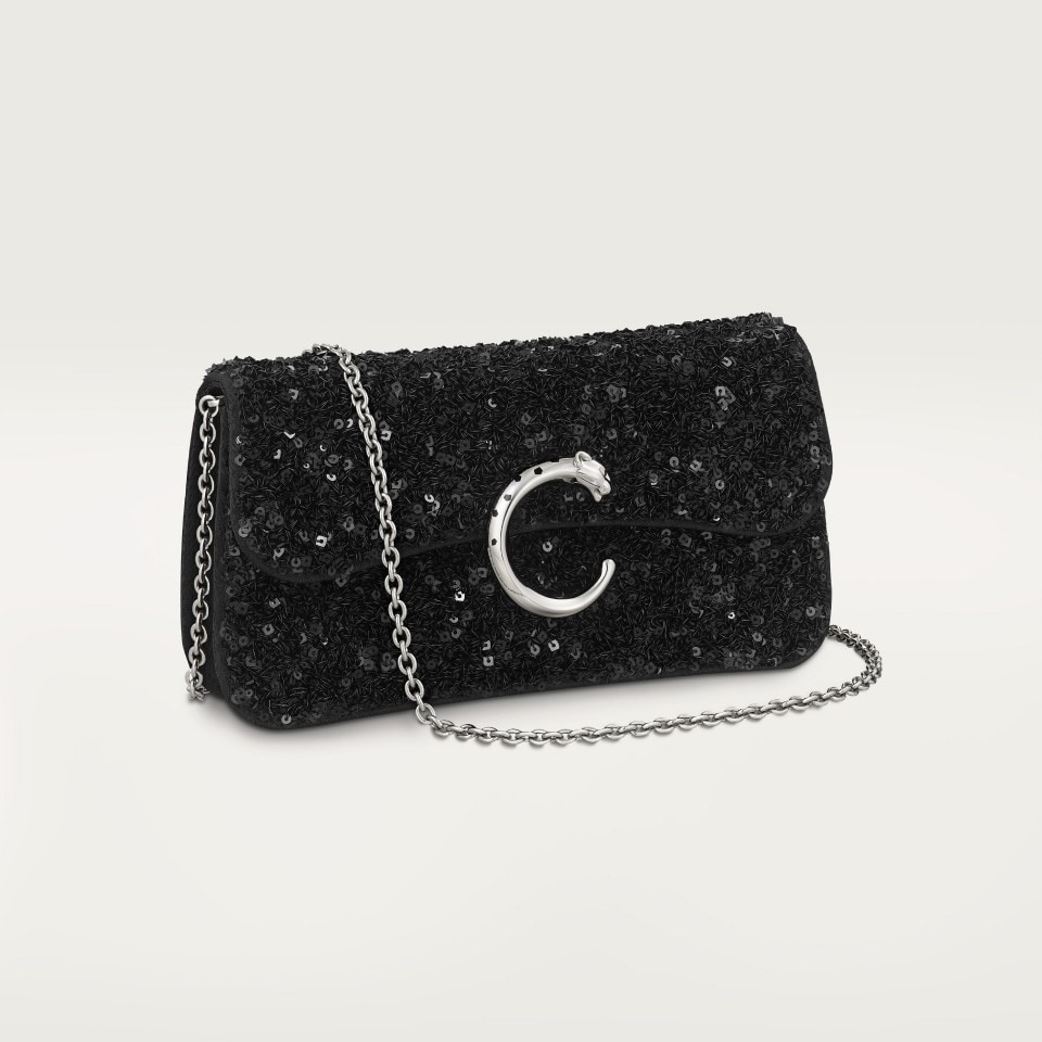 Panthère C de Cartier mini model chain bag in golden metallic calfskin, golden and black enamel-finish clasp, gold “Cartier” signature hot-stamped on the inside. One interior compartment, one flat pocket and one signature pocket. One external flat pocket on the back of the bag. Lining: black lambskin. Removable chain. Dimensions: height 100 mm x length 200 mm x depth 45 mm. Hand and cross-body carry.