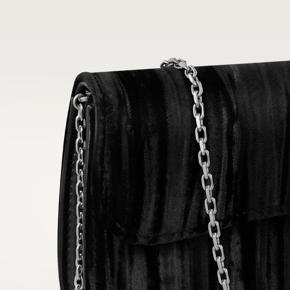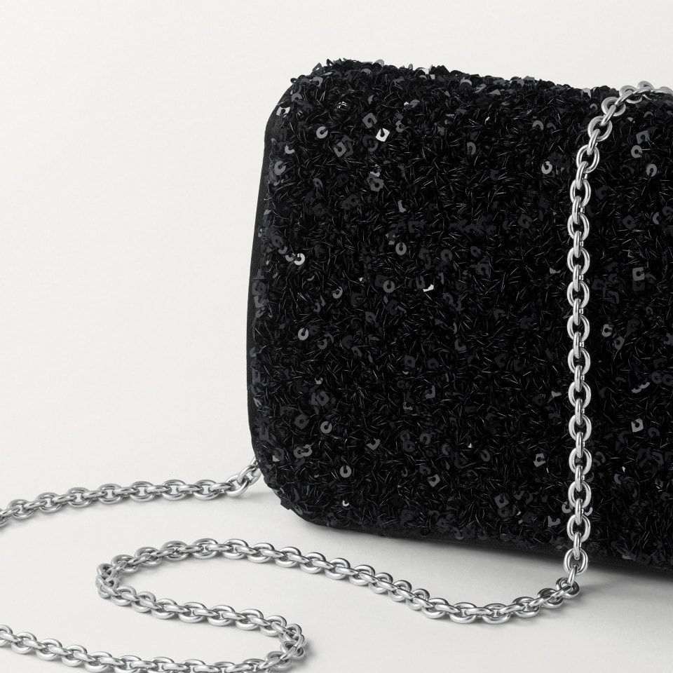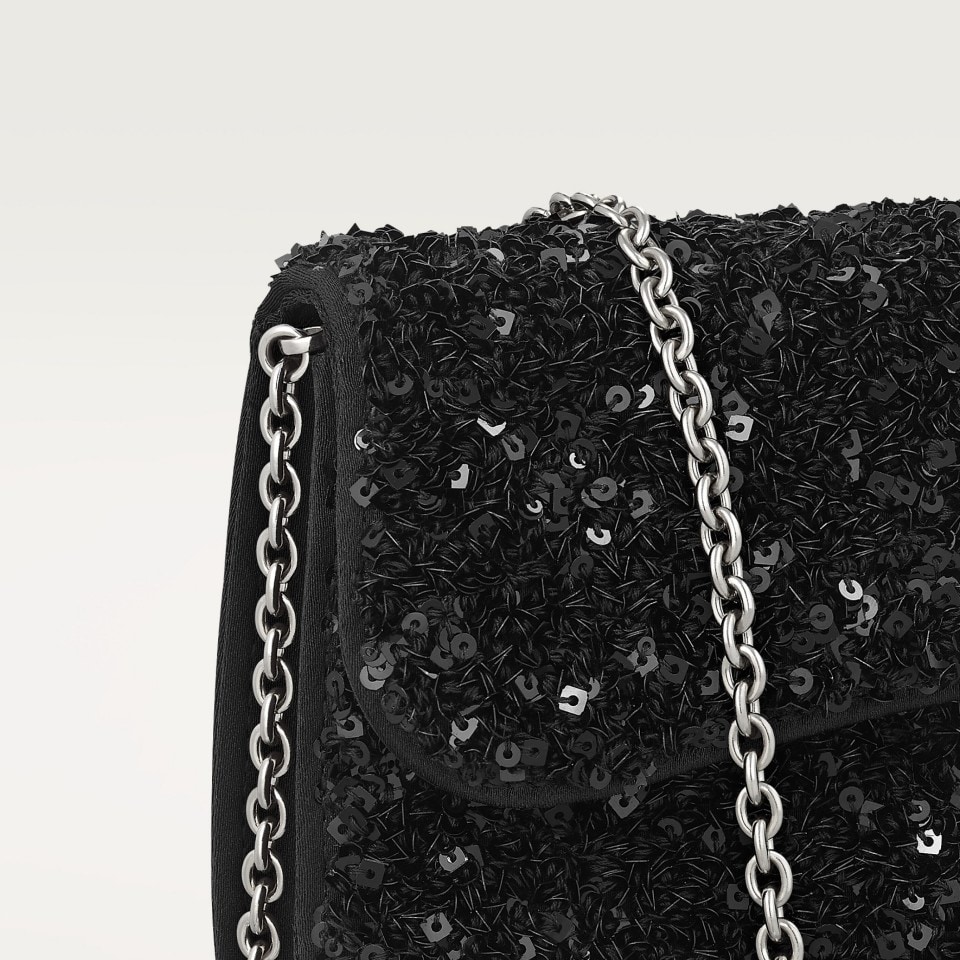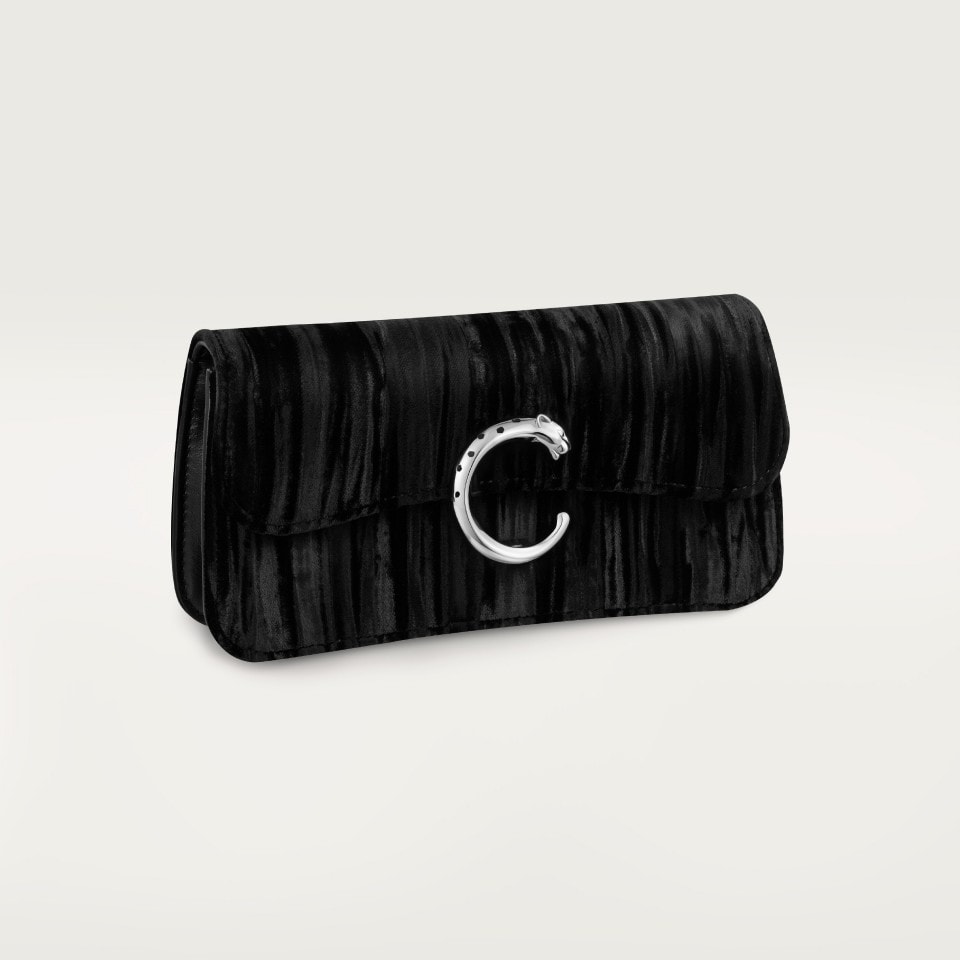 Panthère C de Cartier mini model chain bag in golden metallic calfskin, golden and black enamel-finish clasp, gold “Cartier” signature hot-stamped on the inside. One interior compartment, one flat pocket and one signature pocket. One external flat pocket on the back of the bag. Lining: black lambskin. Removable chain. Dimensions: height 100 mm x length 200 mm x depth 45 mm. Hand and cross-body carry.