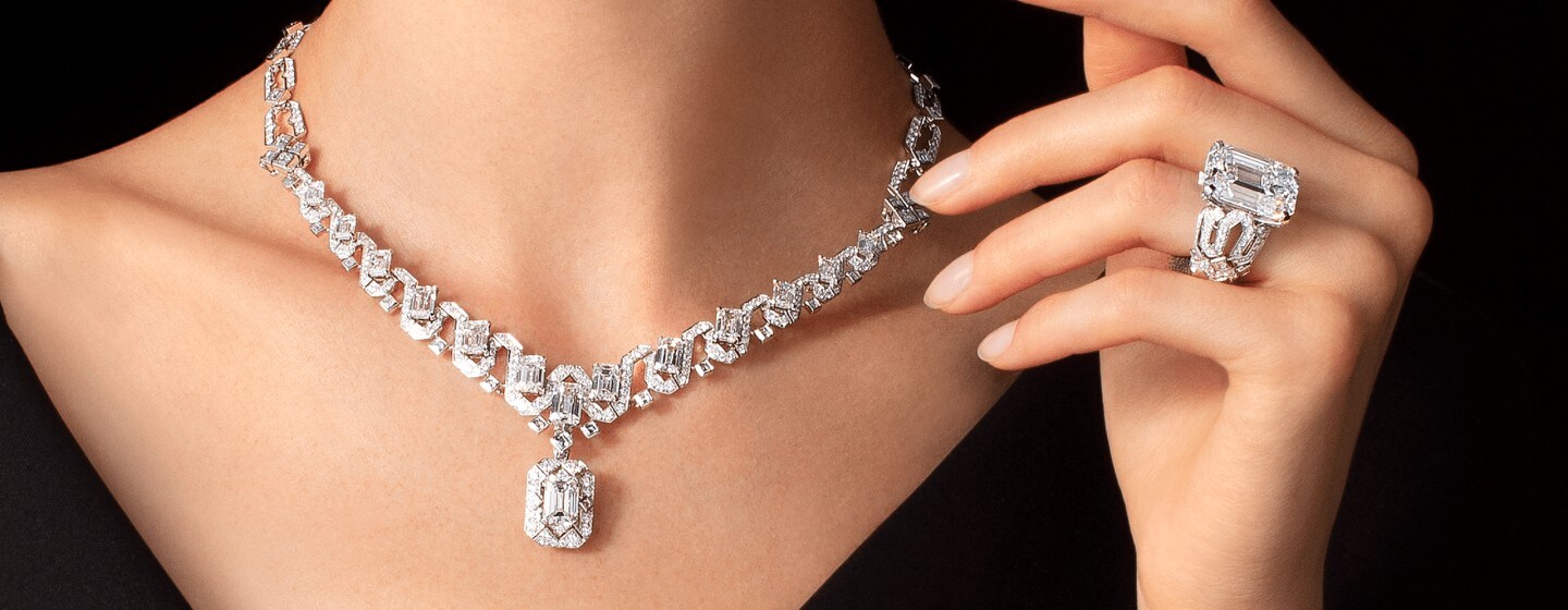 The necklace is made up of six diamond cuts: kite, octagonal, emerald, triangle, baguette and brilliant. Graded D IF and E IF, the main diamonds have been chosen for their quality. Their combination sets the whole jewel alight. With its perfectly geometrical design, the lines draw the gaze to the pendant, a spectacular addition of a 3-carat kite diamond, a 1.62-carat octagonal diamond and a 1.54-carat emerald-cut diamond. The suppleness showcases the jewellers’ high standards and talent.