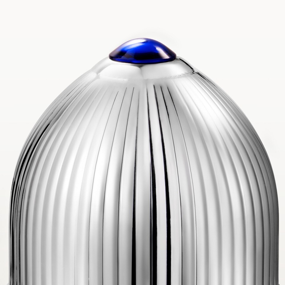 True to the House's eco-responsible commitments, the Pasha de Cartier bottle has been redesigned to reduce glass weight by 56% and plastic use by 19%. Favoring sustainable materials, the bottle is composed of 12% recycled glass. The emblematic gadroons of the range emphasize a lighter silhouette and highlight the blue cabochon, a tribute to Cartier's watchmaking icon.