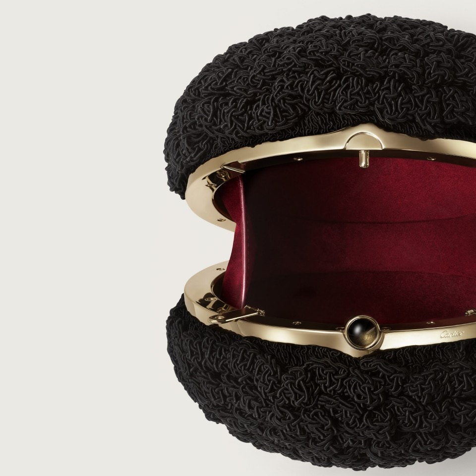 Round bag in black silk crochet with a Cactus de Cartier motif, Cartier Soir, gold-finish clasp adorned with a golden obsidian, Cartier signature engraved on the frame. Removable chain. One inside compartment. Lining: burgundy calfskin. Diameter: 130 mm. Shoulder and hand carry.