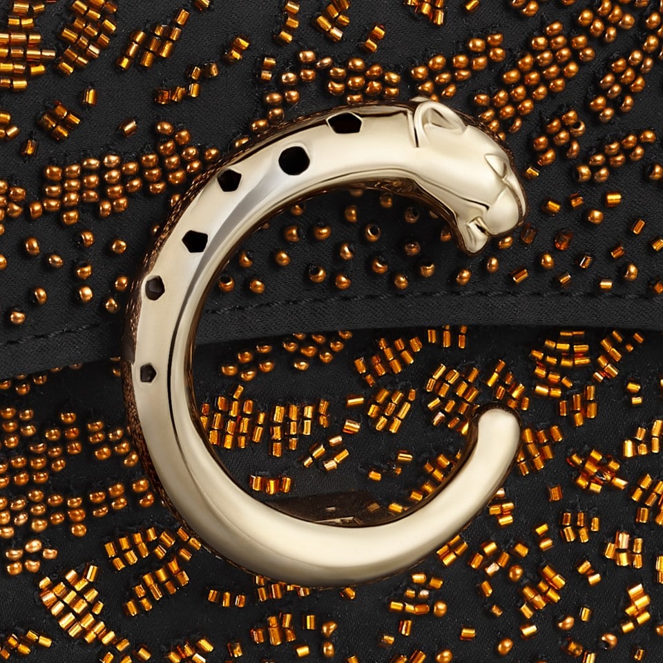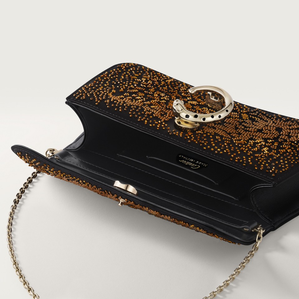 Panthère C de Cartier mini model chain bag in black satin calfskin with multicolored bronze bead embroidery, golden and black enamel-finish clasp, golden hot-stamped “Cartier” signature on the inside. One interior compartment, one flat pocket and one signature pocket. Lining: black lambskin. Removable chain. Dimensions: height 100 mm x length 200 mm x depth 45 mm. Hand and cross-body carry.