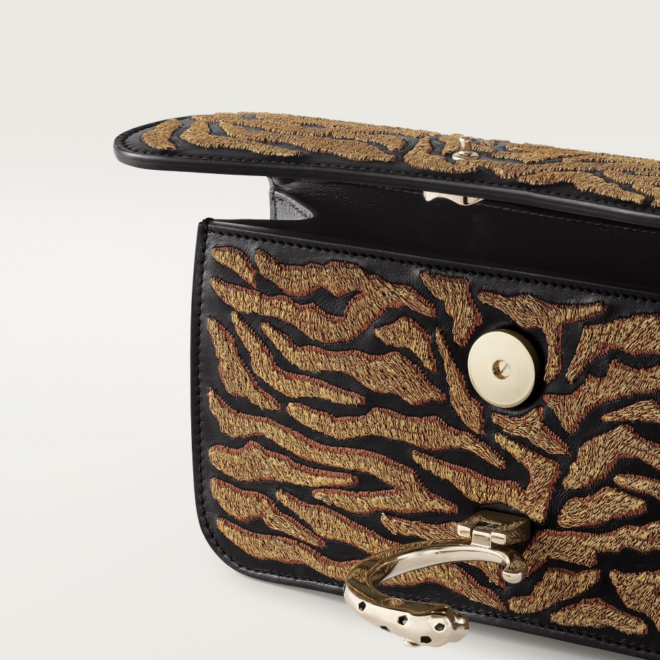 Panthère C de Cartier mini model chain bag in black calfskin with golden thread tiger motif embroidery, golden and black enamel-finish clasp, golden hot-stamped “Cartier” signature on the inside. One interior compartment, one flat pocket and one signature pocket. Lining: black lambskin. Removable chain. Dimensions: height 100 mm x length 200 mm x depth 45 mm. Hand and cross-body carry.