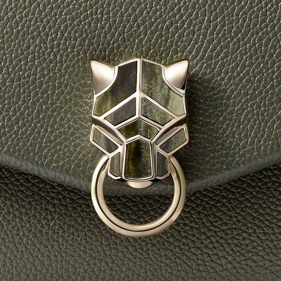 Small model chain bag, Panthère Graphique de Cartier, green tea calfskin, golden-finish clasp with marble effect, golden hot-stamped “Cartier” signature on the inside. Two interior compartments, one flat pocket and one signature pocket with removable mirror. One pocket on the back. Lining: black lambskin. Dimensions: Height: 160 mm. Length: 235 mm. Depth: 105 mm. Shoulder and cross-body carry.