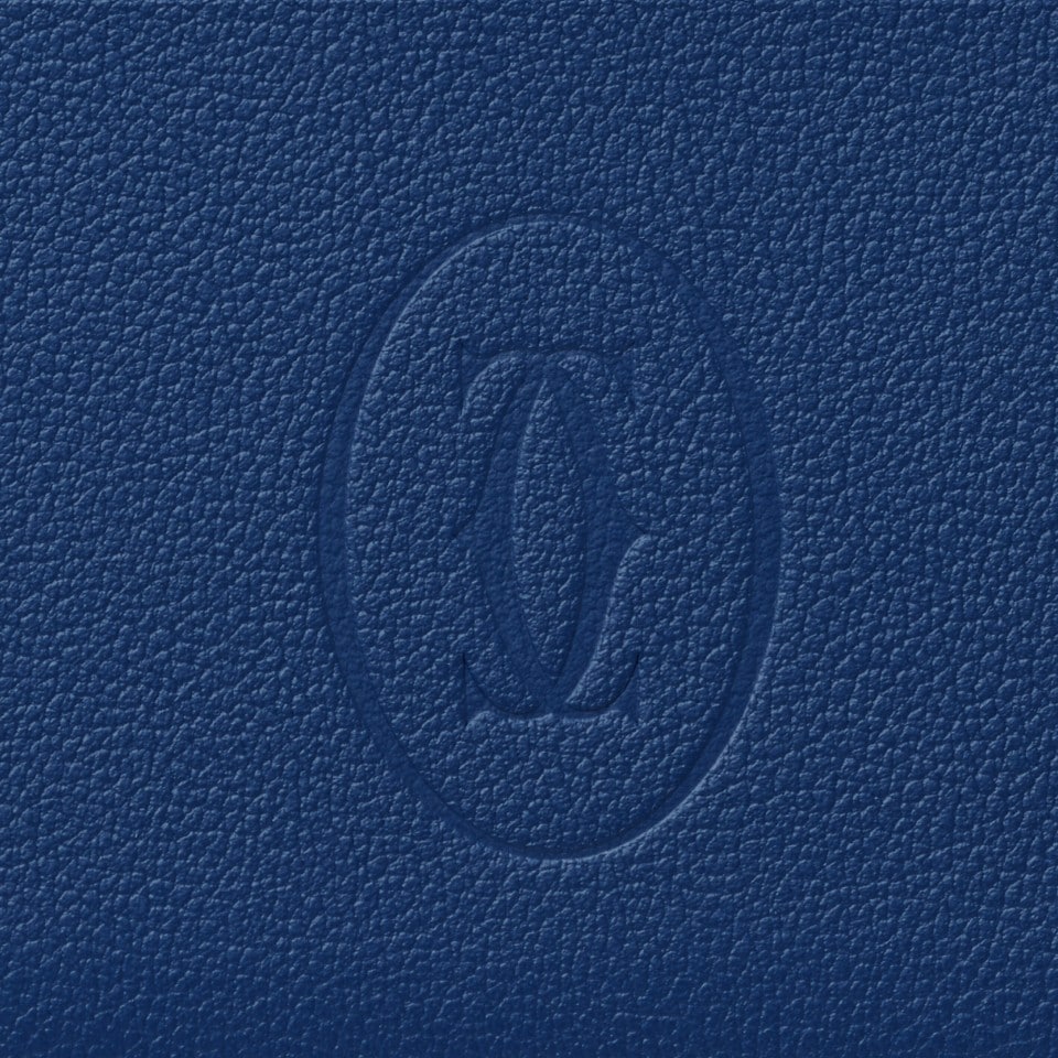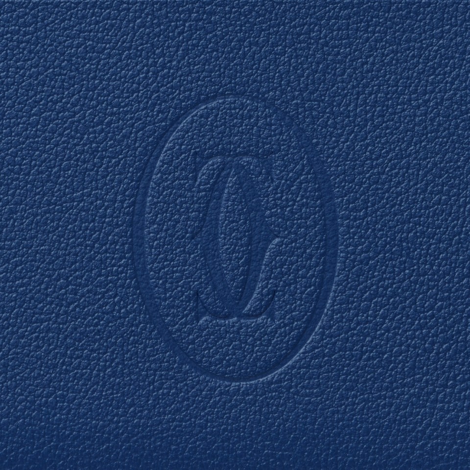 Must de Cartier double card holder in deep blue calfskin. Exterior: embossed double C logo, gold-finish metal corners. Interior: black calfskin, Cartier logo, two flat credit card pockets at the front and two pockets at the back, central pocket. Dimensions: height 105 mm x width 75 mm.