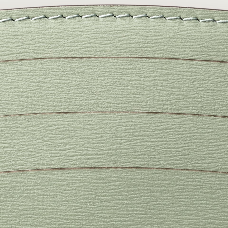 Panthère C de Cartier simple card holder in grained sage green calfskin, golden-finish signature Panthère logo. Interior: black lambskin, one large central insert, three credit card slots on the back, golden hot-stamped “Cartier” signature.