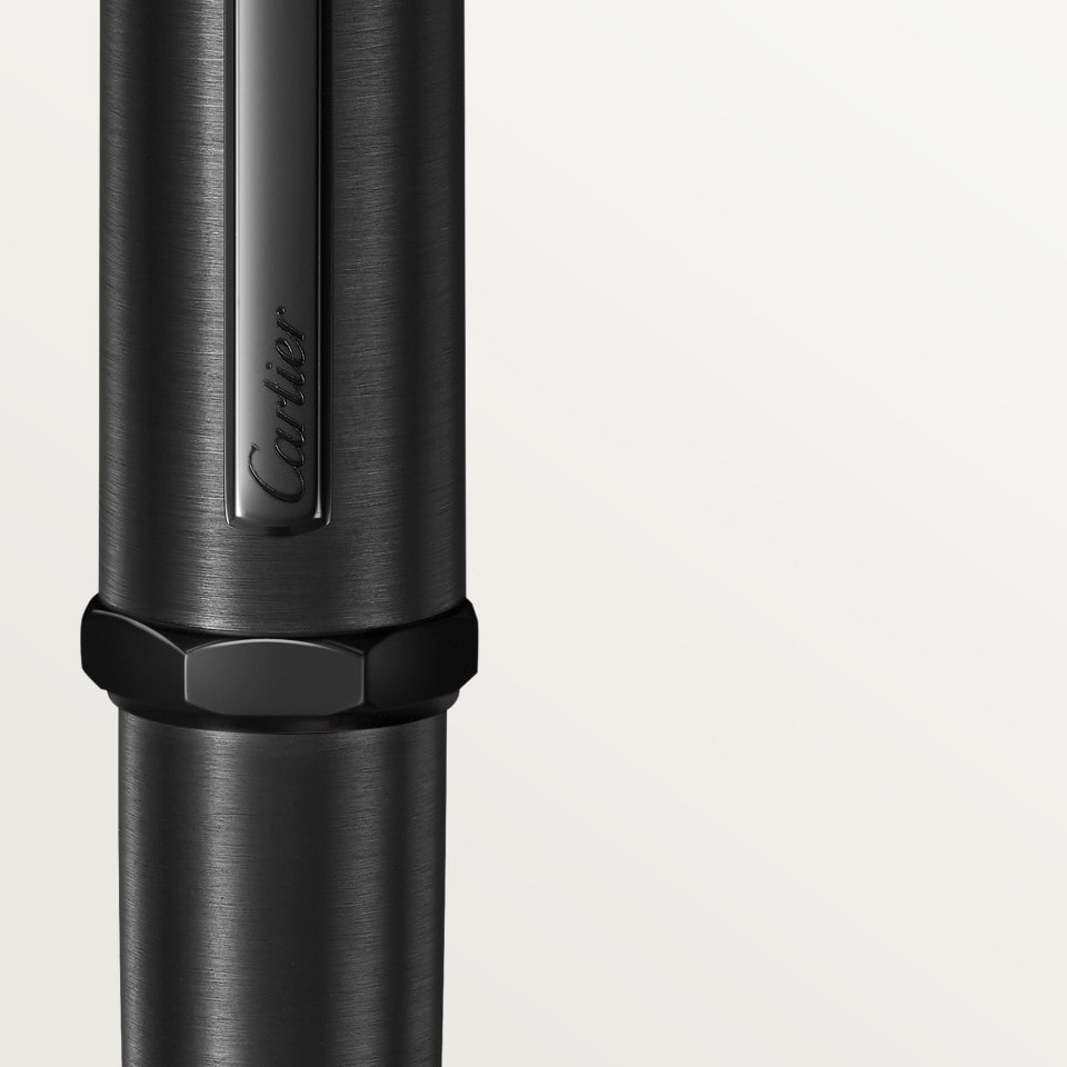 Santos de Cartier ballpoint pen, cap and body in brushed metal and ADLC, clip in polished metal and ADLC, black resin cabochon, palladium-finish screws and cabochon holder.