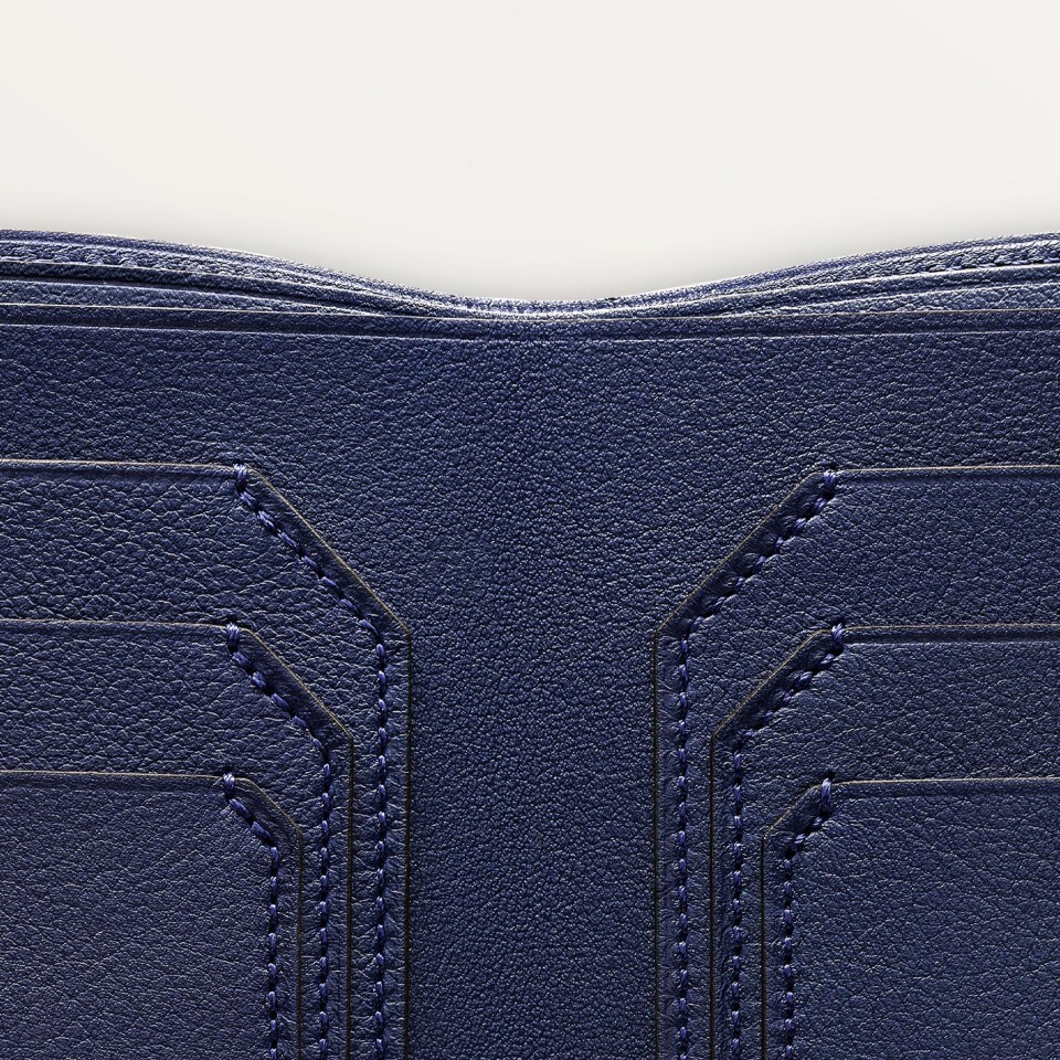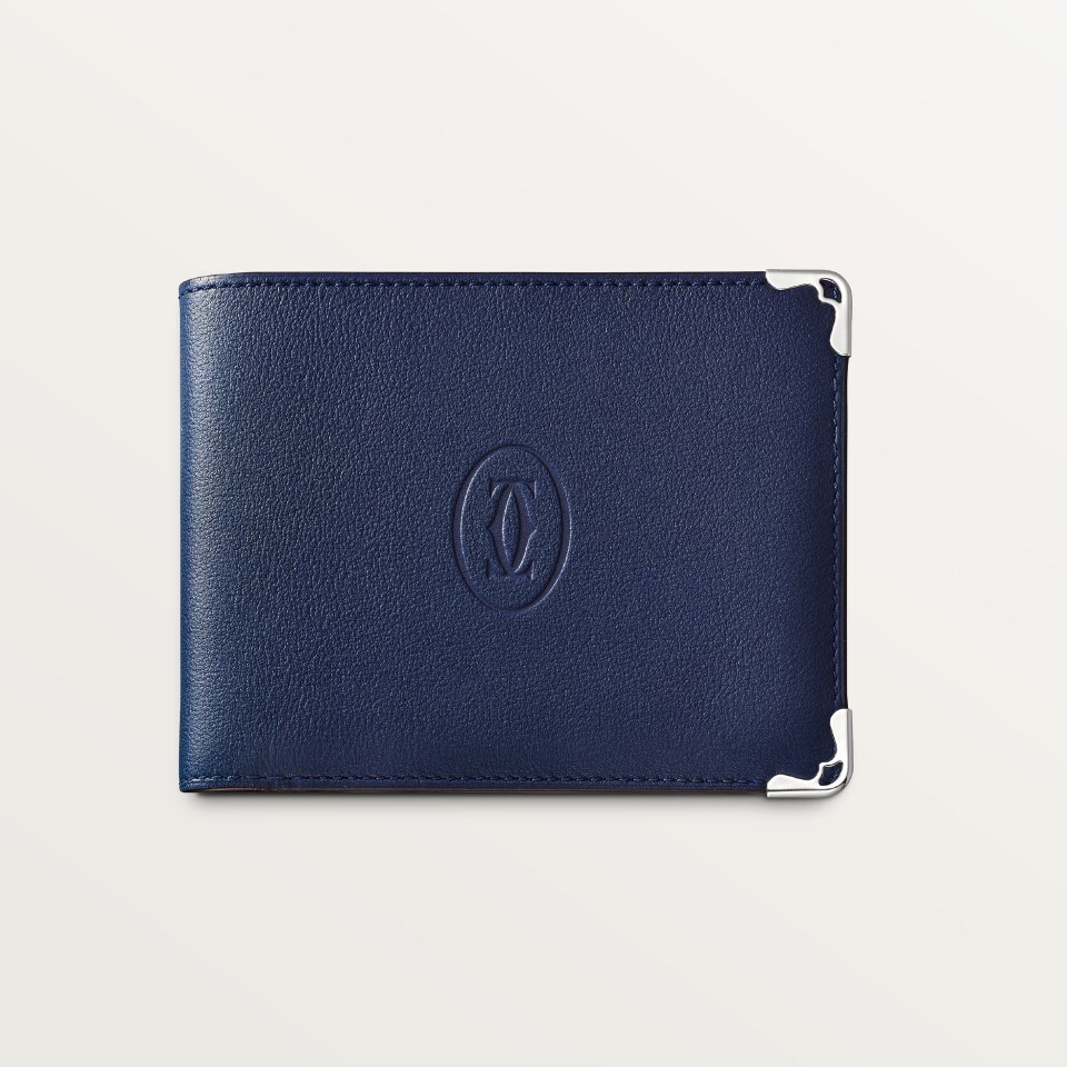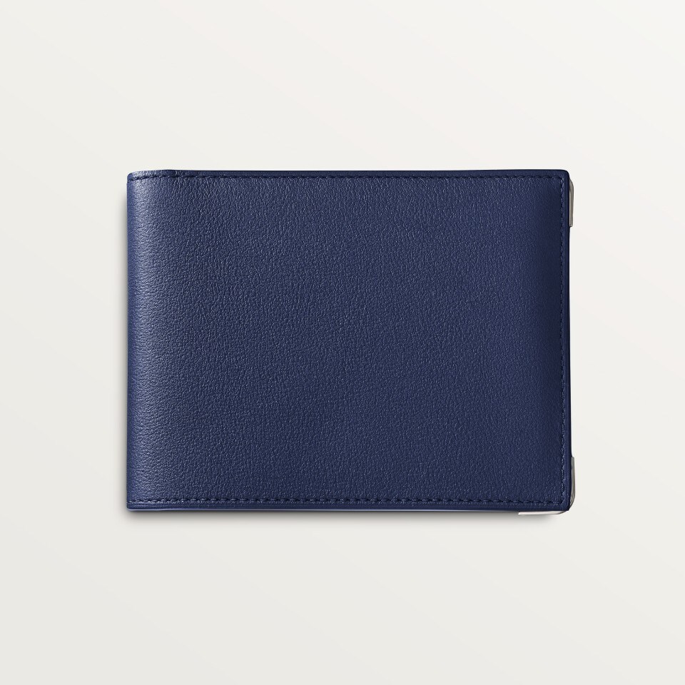 Limited edition. Blue calfskin 6-credit card wallet. Exterior: embossed double C logo, stainless steel metallic-finished corners. Interior: blue calfskin, silver-coloured Cartier marking, 6 credit card pockets, 2 banknote pockets. Dimensions: 91 mm high x 119 mm wide.