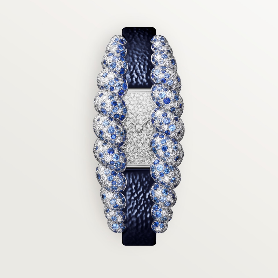 Tressage watch, quartz movement. 18K white gold (750/1000) case set with 742 diamonds totaling 6.60 carats and 330 sapphires totaling 5.90 carats. Rhodiumized 18K white gold (750/1000) dial set with brilliant-cut diamonds, polished steel sword-shaped hands, sapphire crystal. Shiny navy blue leather strap, second strap in smooth navy blue leather, 18K white gold (750/1000) ardillon buckle set with brilliant-cut diamonds. Case dimensions: 56.2 x 25.7 mm, thickness: 11.5 mm. Water-resistant up to 3 bar (approx. 30 meters/100 feet).