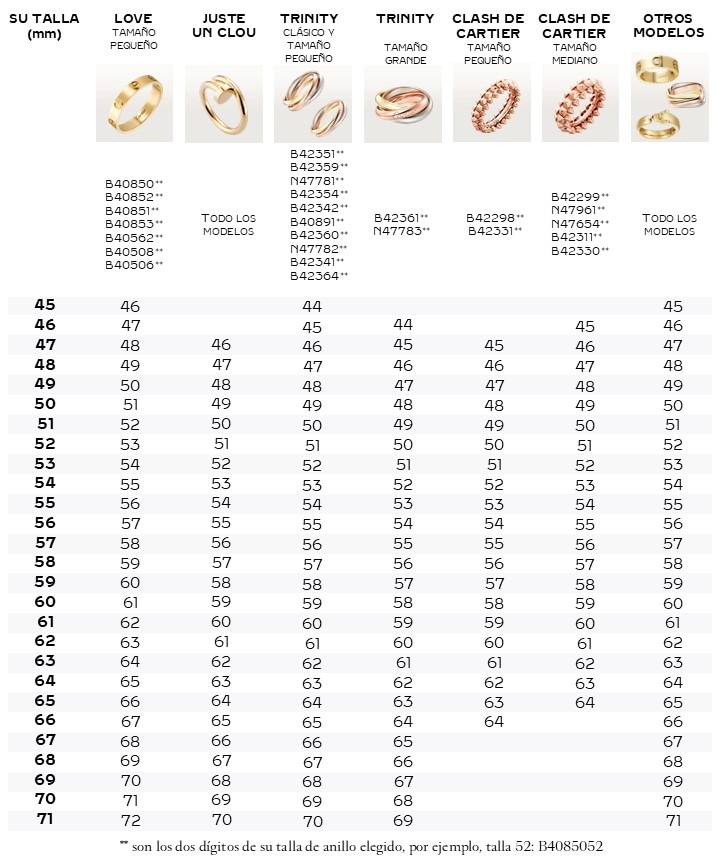 Las tallas de nuestras creaciones Cartier varían en función de las colecciones. Todas las recomendaciones pueden consultarse en la siguiente tabla.