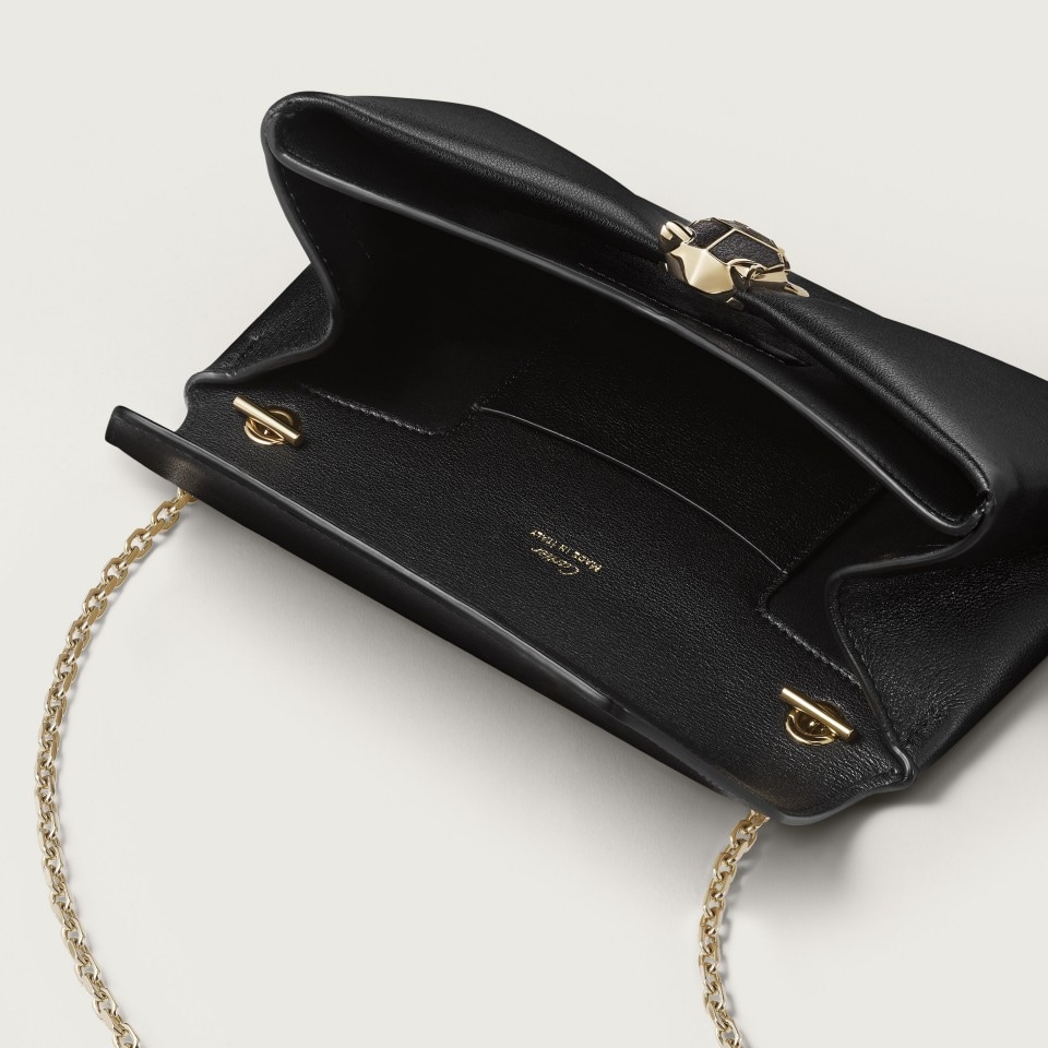Pochette con cadena Panthère de Cartier de piel de becerro negra, cierre acabado dorado, firma Cartier dorada marcada en caliente en el interior. Un compartimento interior y un bolsillo plano. Un bolsillo plano externo en la parte trasera del bolso. Forro: piel de cordero negra. Cadena extraíble. Dimensiones: alto 140 mm x largo 225 mm x profundidad 40 mm. Para llevar en la mano y cruzado.