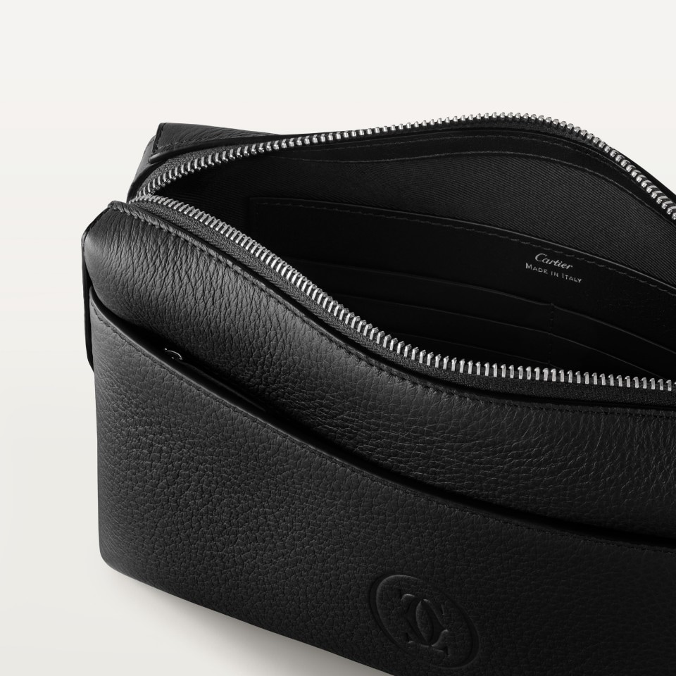 Pochette Must de Cartier de piel de becerro color negro. Cierre con cremallera, piezas metálicas acabado paladio. Exterior: logo doble C grabado, un bolsillo con cremallera, un asa extraíble. Interior: forro de tela color negro, un bolsillo plano, 8 ranuras para tarjetas de crédito. Firma Cartier plateada grabada. Dimensiones: alto 160 mm x ancho 250 mm x grosor 50 mm. Para llevar en la mano o a la muñeca gracias al asa extraíble.