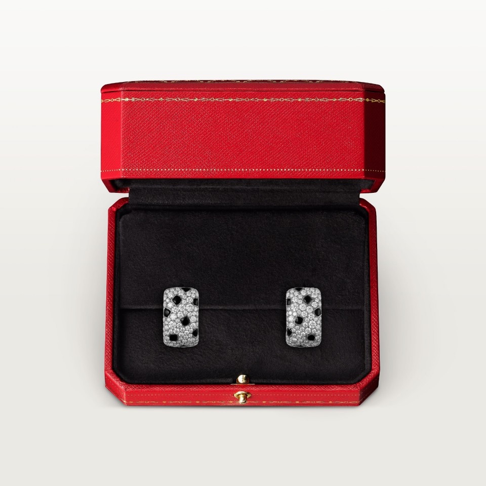 Pendientes Panthère de Cartier, oro blanco 750/1000, ónix, cada uno engastado con 84 diamantes talla brillante con un total de 1,20 quilates.