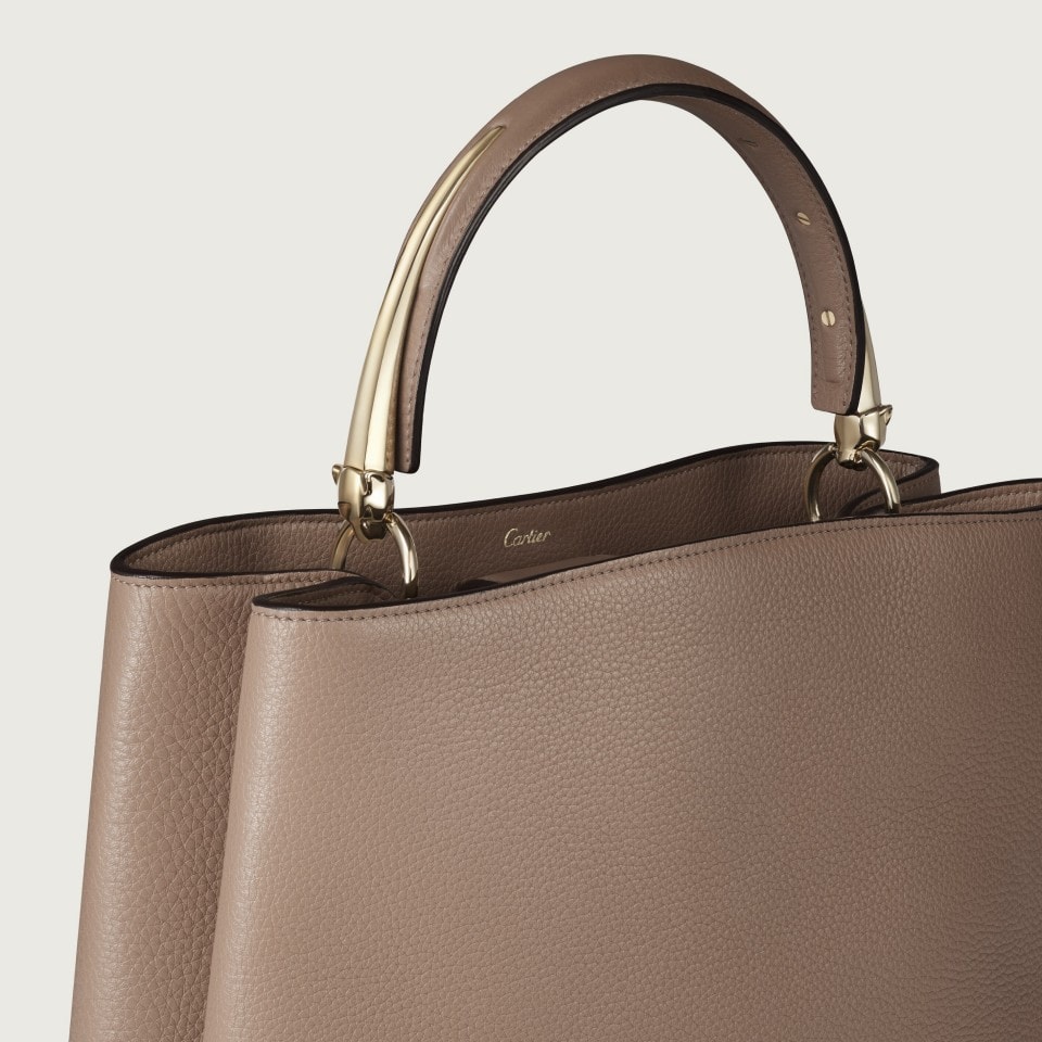 Bolso con asa Panthère Double de Cartier de piel de becerro granulada color arcilla modelo mediano, asa con figuración de una pantera acabado dorado, firma Cartier dorada marcada en caliente en el interior. Dos compartimentos interiores separados por un pequeño bolsillo plano central, un bolsillo plano interior y una pochette extraíble con cremallera de piel de becerro granulada de un mismo color. Bandolera ajustable y extraíble de piel de becerro granulada color arcilla. Cierre con pieza de piel de un mismo color magnética. Cinco pies protectores de metal. Forro: piel de cordero negra. Dimensiones: alto 230 mm x largo 290 mm x profundidad 120 mm. Para llevar en la mano y cruzado.