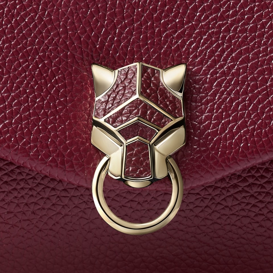 Bolso de cadena Panthère Graphique de Cartier de piel de becerro granulada burdeos tamaño nano, cierre acabado dorado, firma Cartier dorada marcada en caliente en el interior. Tres compartimentos interiores, un bolsillo plano. Forro: piel de cordero negra. Cadena extraíble. Dimensiones: alto 120 mm x largo 200 mm x profundidad 40 mm. Para llevar al hombro y cruzado.