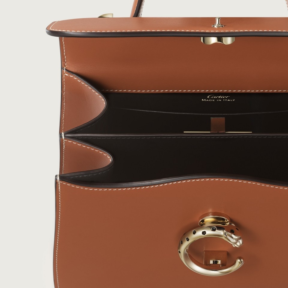 Bolso con asa Panthère C de Cartier de piel de becerro caramelo tamaño pequeño, cierre acabado dorado y esmalte negro, firma Cartier dorada marcada en caliente en el interior. Dos compartimentos interiores, un bolsillo plano, un bolsillo característico y su espejo extraíble. 1 bolsillo plano externo en la parte trasera del bolso. Forro: piel de cordero negra. Dimensiones: alto 180 mm x largo 210 mm x profundidad 90 mm. Para llevar en la mano o cruzado.