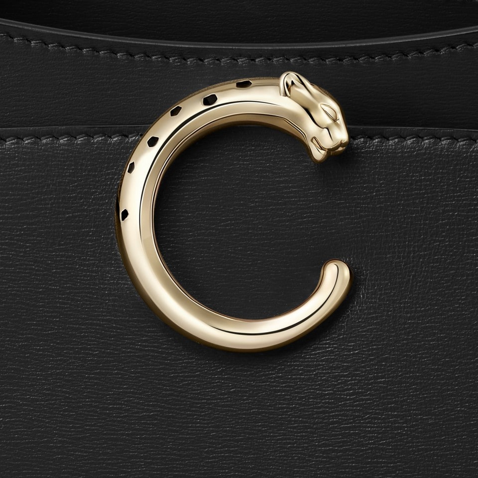 Sac avec poignée petit modèle Panthère C de Cartier en cuir de veau grainé couleur noir, fermoir finition dorée et émail noir, signature "Cartier" couleur or marquée à chaud à l'intérieur.