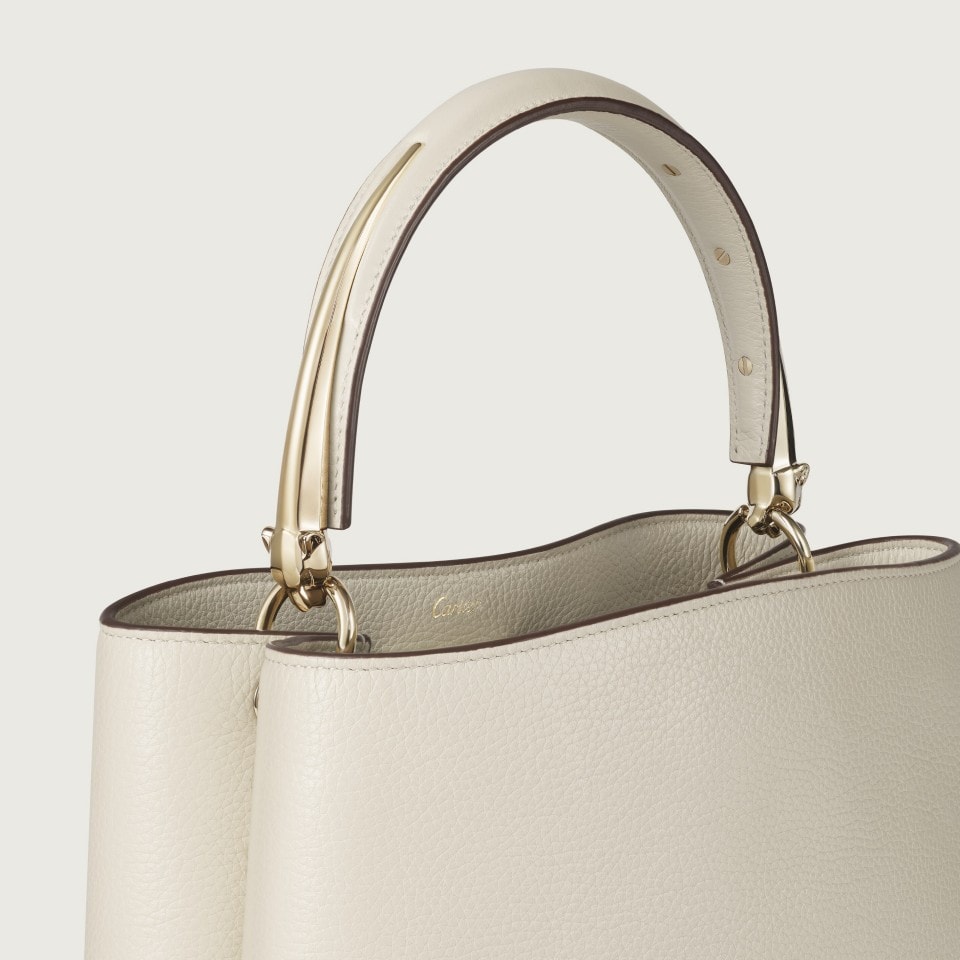 Sac avec poignée petit modèle en cuir de veau grainé couleur blanc sel, poignée avec figuration panthère finition dorée, signature Cartier couleur or marquée à chaud à l'intérieur. Un compartiment intérieur, une poche plate plaquée interne et une pochette zippée amovible en cuir de veau grainé ton sur ton. Fermeture aimantée sur mini rabat en cuir. Bandoulière ajustable et amovible en cuir de veau grainé couleur blanc sel. Quatre pieds de fond en métal protecteurs. Doublure: agneau noir. Dimensions : hauteur 240 mm x longueur 190 mm x profondeur 110 mm. Porté main et croisé.