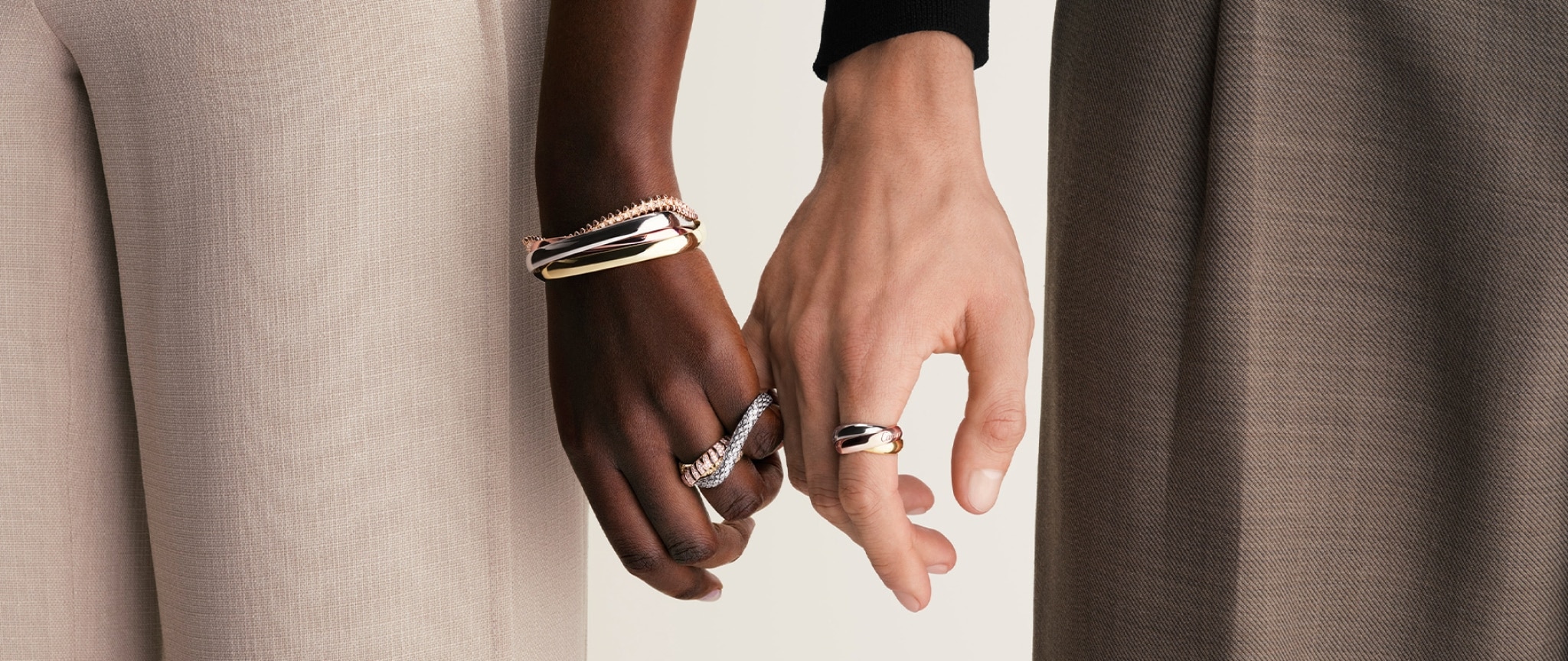 Bagues Trinity Trois anneaux d’or, jaune, rose et blanc qui fusionnent, se comprennent, jouent ensemble la même partition à trois.