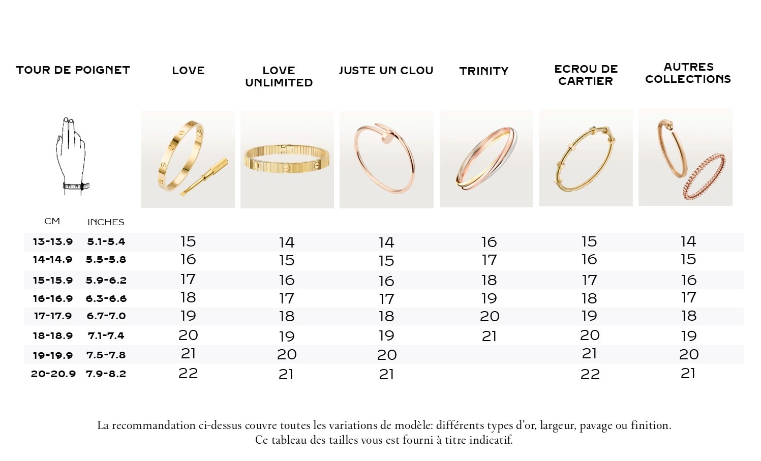 Les tailles de nos créations Cartier varient en fonction de nos collections. Retrouvez l’ensemble des tailles de bracelets dans notre tableau des tailles: