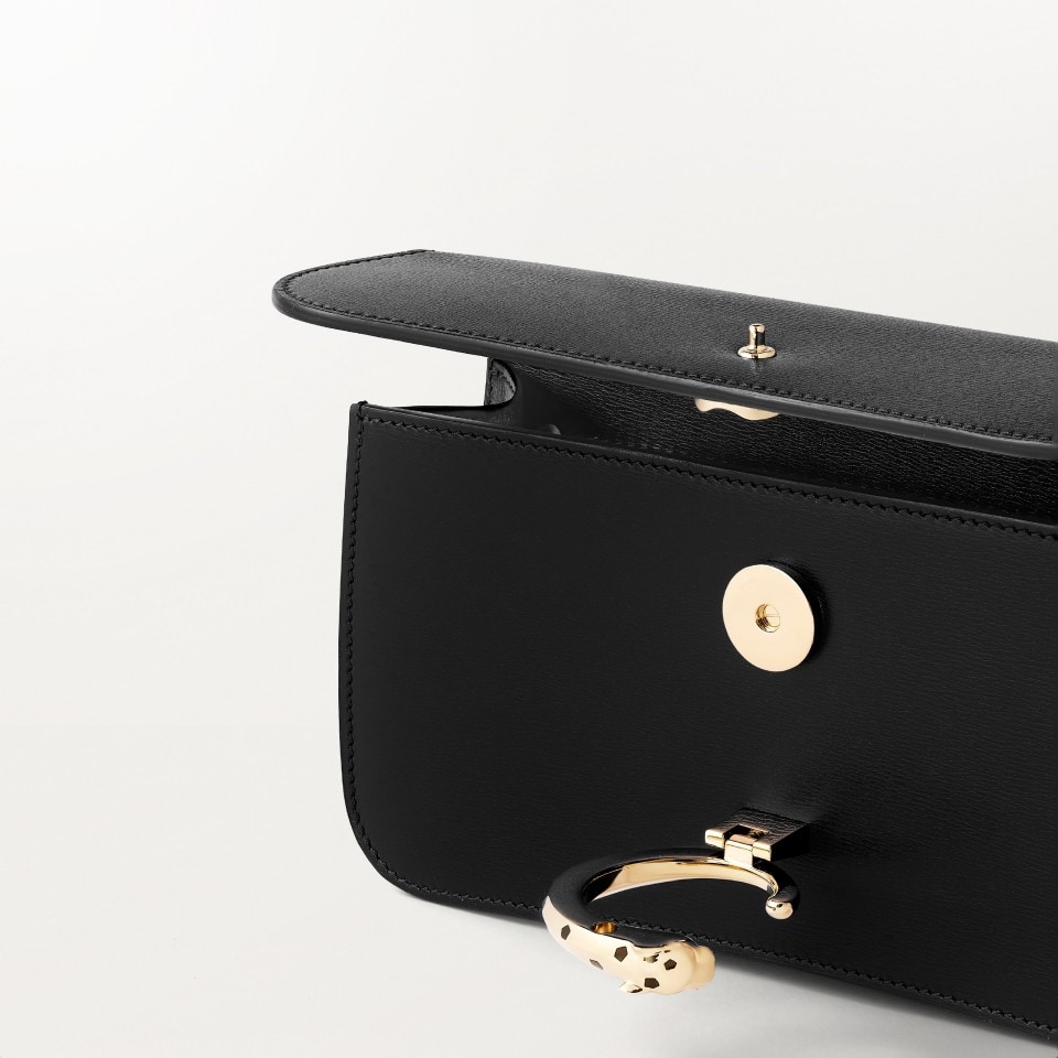 Sac chaine mini modèle Panthère C de Cartier en cuir de veau couleur noir, fermoir finition dorée et émail noir, signature "Cartier" couleur or marquée à chaud à l'intérieur. Un compartiment intérieur, une poche plate et une poche signature. Une poche plate externe à l'arrière du sac. Doublure: agneau noir. Chaine amovible. Dimensions : hauteur 100 mm x longueur 200 mm x profondeur 45 mm. Porter main et cross body.