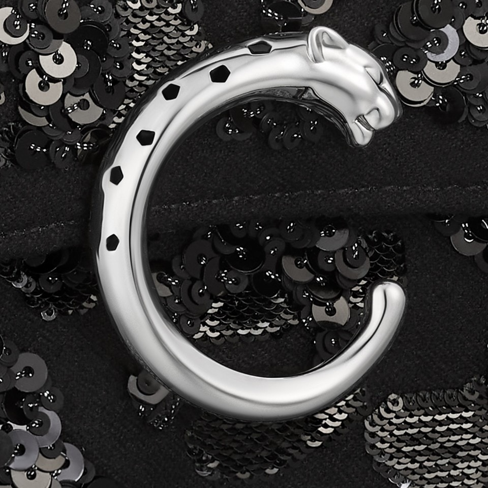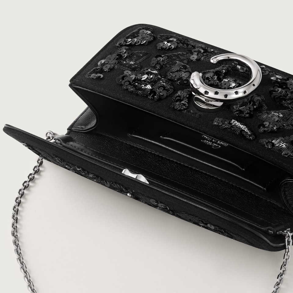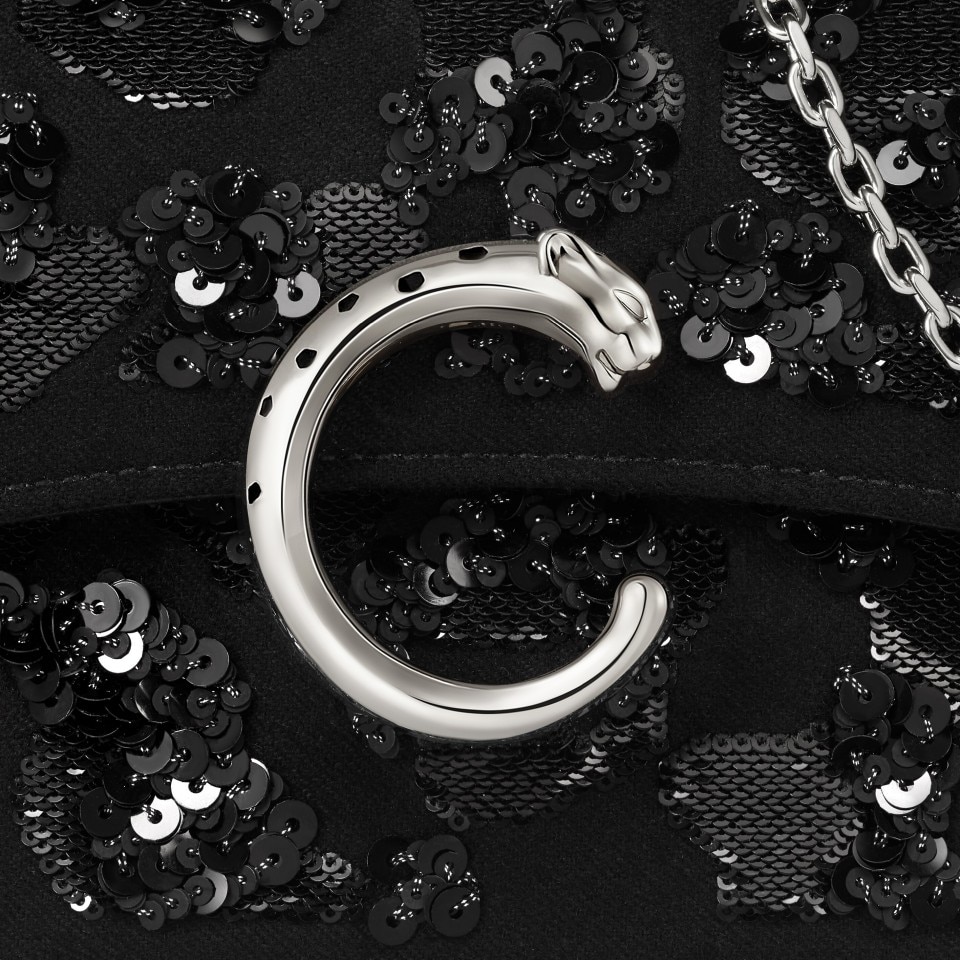 Sac chaine mini modèle Panthère C de Cartier avec broderies sequins et fil irisé sur base laine, fermoir finition palladiée et émail noir, signature Cartier couleur argentée marquée à chaud à l'intérieur. Un compartiment intérieur, une poche plate et une poche signature. Doublure : agneau noir. Chaine amovible. Dimensions : hauteur 100 mm x longueur 200 mm x profondeur 45 mm. Porter main et cross body.