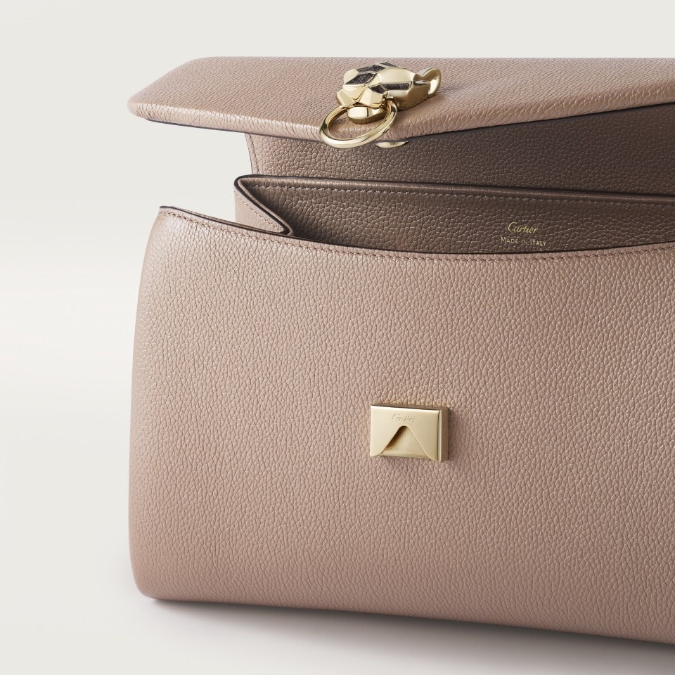 Sac chaine petit modèle Panthère de Cartier en cuir de veau grainé couleur argile, fermoir effet marbre et finition dorée, signature "Cartier" couleur or marquée à chaud à l'intérieur. Deux compartiments intérieurs, une poche plate et une poche signature et son miroir amovible. Une poche à l'arrière. Doublure : agneau noir. Dimensions : hauteur 160 mm x longueur 235 mm x profondeur 105 mm. Porté épaule et croisé.