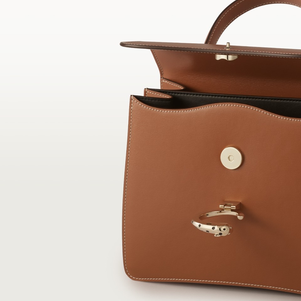 Sac avec poignée petit modèle Panthère C de Cartier en cuir de veau couleur caramel, fermoir finition dorée et émail noir, signature Cartier couleur or marquée à chaud à l'intérieur. Deux compartiments intérieurs, une poche plate et une poche signature et son miroir amovible. Une poche plate externe à l'arrière du sac. Doublure: agneau noir. Dimensions : hauteur 180 mm x longueur 210 mm x profondeur 90 mm. Porter main et cross body.