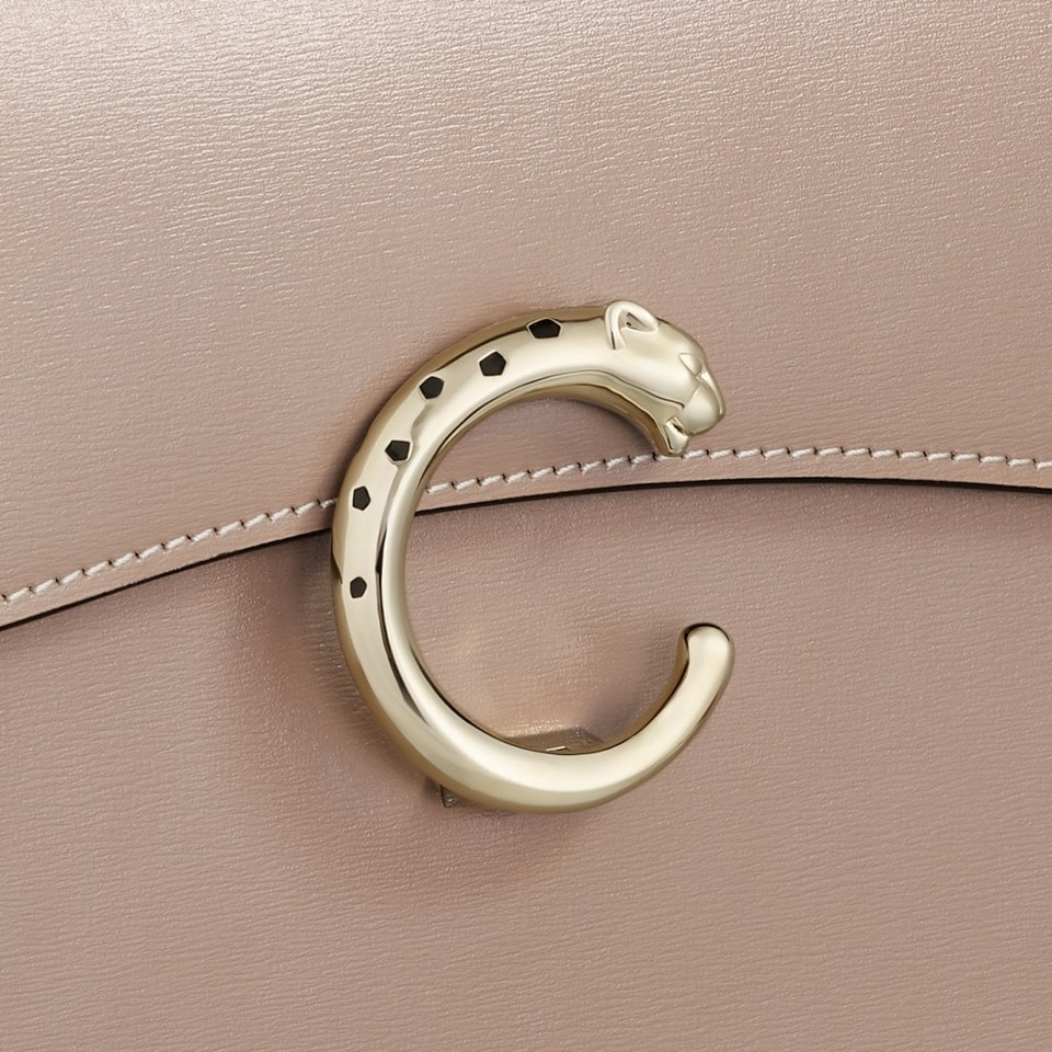 Sac avec poignée petit modèle Panthère C de Cartier en cuir de veau couleur argile, fermoir finition dorée et émail noir, signature Cartier couleur or marquée à chaud à l'intérieur. Deux compartiments intérieurs, une poche plate et une poche signature et son miroir amovible. Une poche plate externe à l'arrière du sac. Doublure: agneau noir. Dimensions : hauteur 180 mm x longueur 210 mm x profondeur 90 mm. Porter main et cross body.