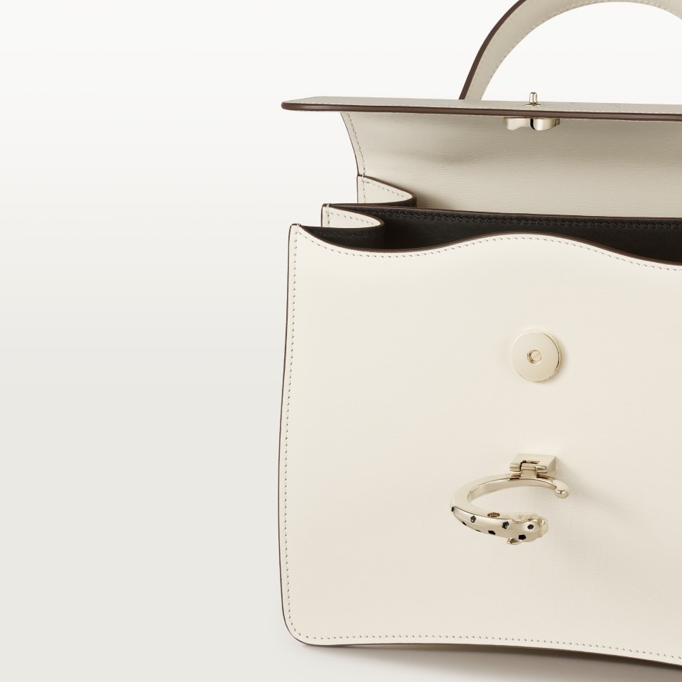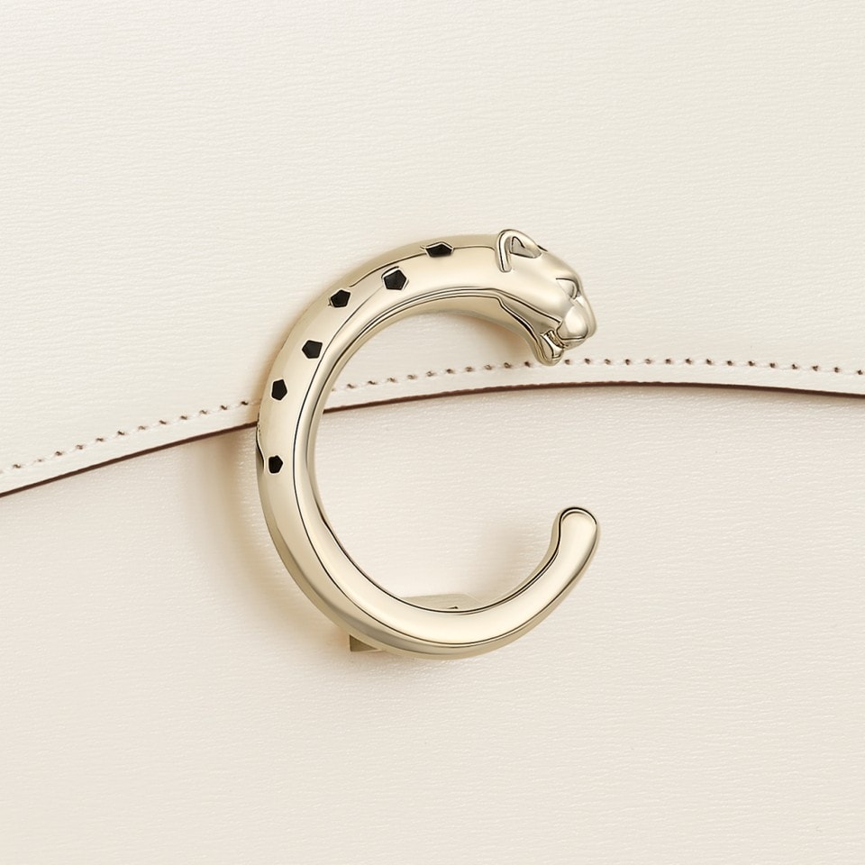 Sac avec poignée petit modèle Panthère C de Cartier en cuir de veau couleur blanc sel, fermoir finition dorée et émail noir, signature Cartier couleur or marquée à chaud à l'intérieur. Deux compartiments intérieurs, une poche plate et une poche signature et son miroir amovible. Une poche plate externe à l'arrière du sac. Doublure: agneau noir. Dimensions : hauteur 180 mm x longueur 210 mm x profondeur 90 mm. Porté main et croisé.