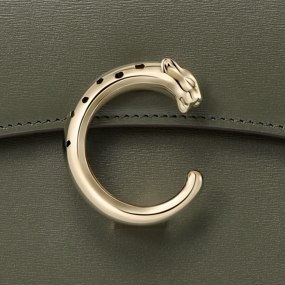 Sac avec poignée petit modèle Panthère C de Cartier en cuir de veau couleur thé vert, fermoir finition dorée et émail noir, signature Cartier couleur or marquée à chaud à l'intérieur. Deux compartiments intérieurs, une poche plate et une poche signature et son miroir amovible. Une poche plate externe à l'arrière du sac. Doublure: agneau noir. Dimensions : hauteur 180 mm x longueur 210 mm x profondeur 90 mm. Porté main et croisé.
