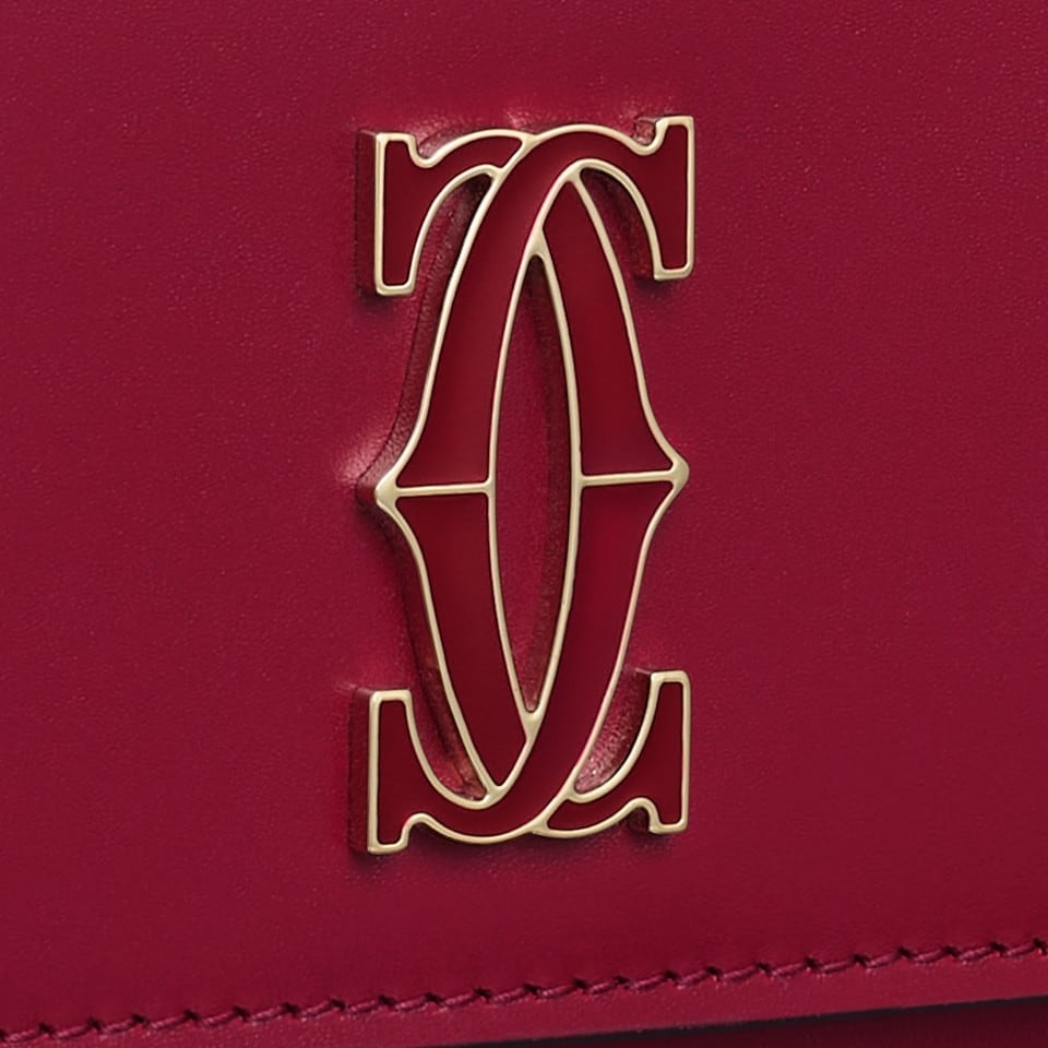 Portefeuille à chaîne C de Cartier en cuir de veau rouge cerise, logo Cartier signature finition dorée et émail rouge cerise. Intérieur: cuir d'agneau noir, 2 soufflets, 8 poches cartes de crédit, 1 poche monnaie zippée, 1 poche plate, 1 poche centrale. marquage à chaud "Cartier" couleur or. Chaîne amovible. Dimensions: longueur 190 mm x hauteur 105 mm x profondeur 30 mm.