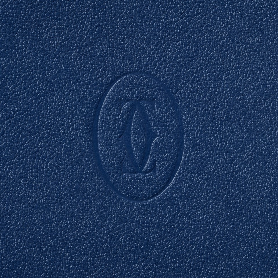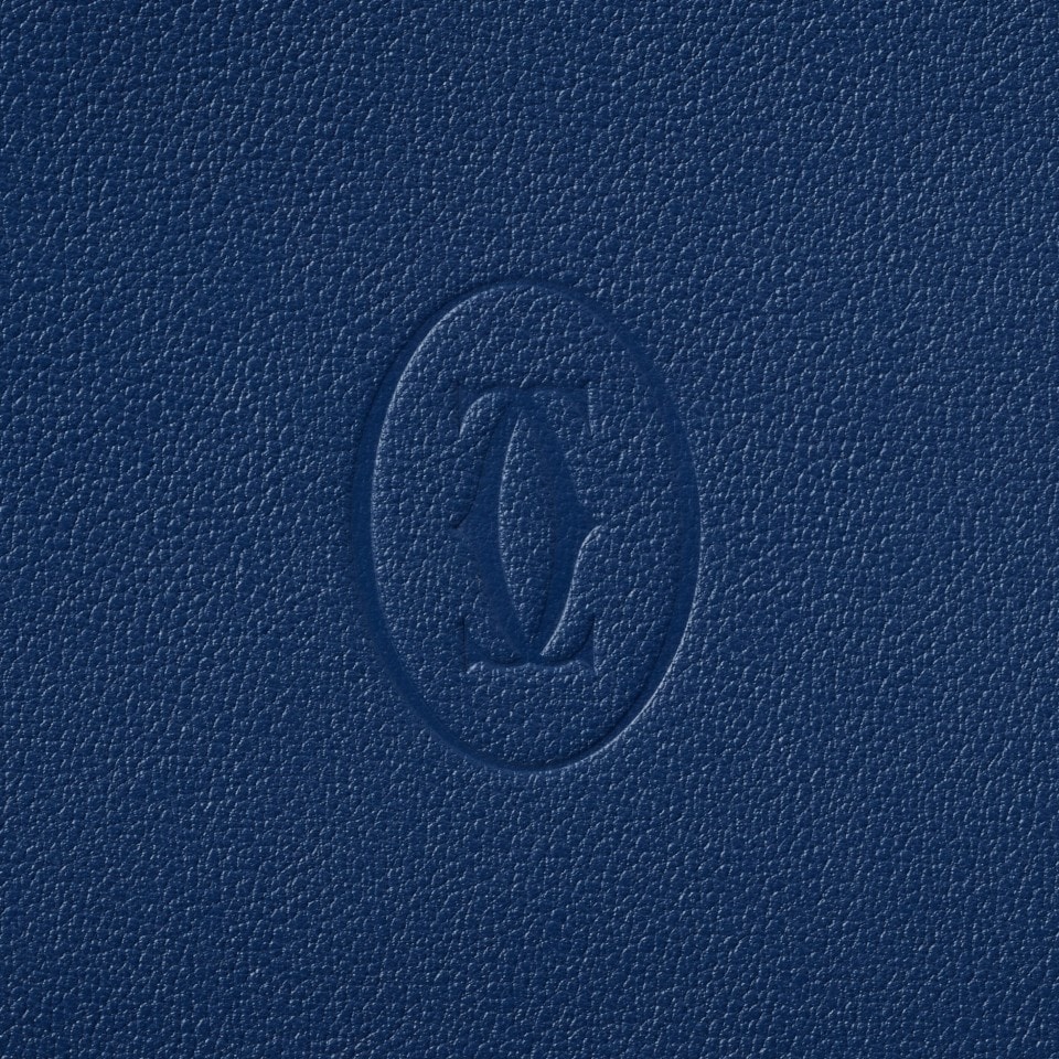 Portefeuille 6 cartes de crédit Must de Cartier en cuir de veau deep blue. Extérieur : logo double C embossé, coins métalliques en finition dorée. Intérieur : cuir de veau deep blue, marquage Cartier couleur or, 6 poches cartes de crédit, 2 poches billet. Dimensions : hauteur 91 mm x largeur 119 mm.