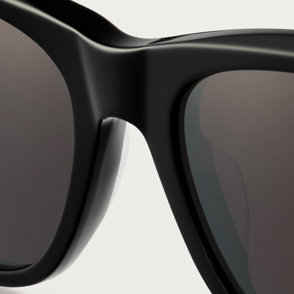 Lunettes solaires Première de Cartier en acétate noir, forme rectangulaire et verres gris. Dimensions : verres 53 mm, pont 20 mm, branches 145 mm