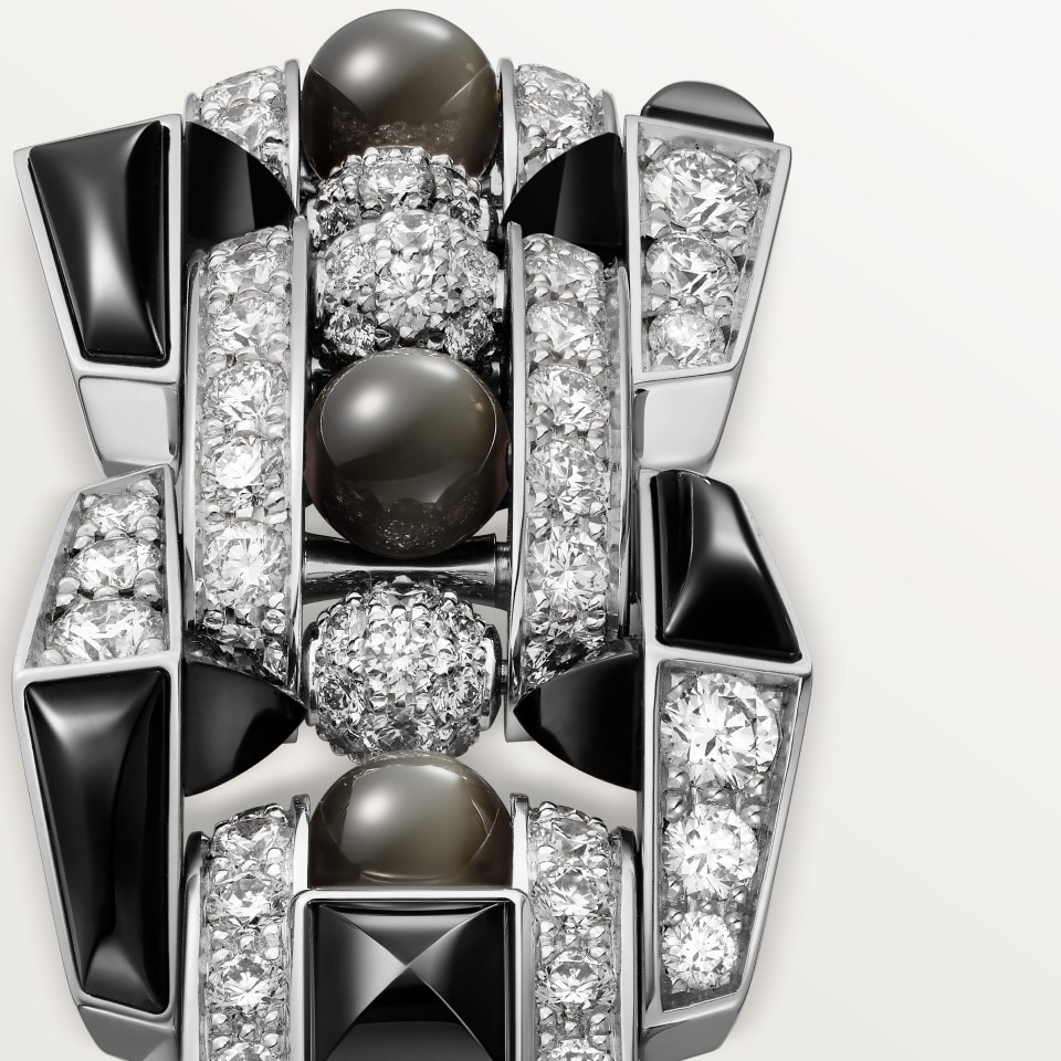 La mécanique est belle quand elle a de l’allure, c’est la signature de la montre Clash [Un]limited : une montre bijou qui oppose la finesse à la force. Boules, picots, clous carrés et mobilité : les codes de la collection Clash de Cartier défilent, s’imbriquent, tracent leur route et se manifestent sous la forme d’une montre précieuse.