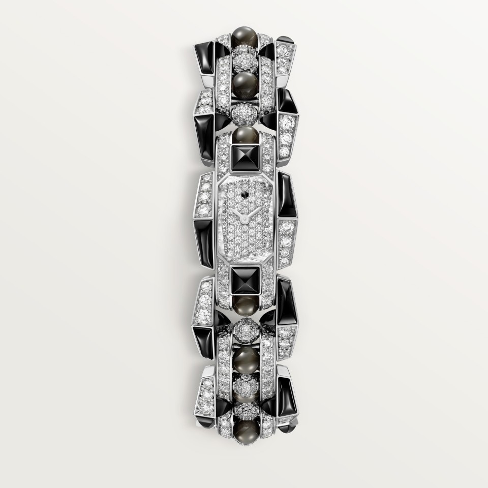 Montre Clash [Un]limited, petit modèle, mouvement à quartz. Boîte en or gris rhodié 750/1000 sertie de 28 diamants taille brillant pour 0,73 carat, spinelles, obsidienne. Bracelet en or gris rhodié 750/1000 serti de 603 diamants taille brillant pour 9,23 carats, spinelles, obsidienne. Cadran en or gris rhodié 750/1000 serti de 71 diamants taille brillant pour 0,39 carat, spinelle. Aiguilles en forme de glaive en acier finition rhodiée, glace saphir. Taille de la boîte : 18,4 x 32,7 mm, épaisseur 8,1 mm. Etanche à 3 bars (environ 30 mètres).