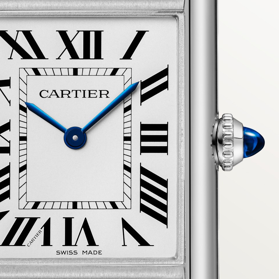 Montre Tank Must, grand modèle, mouvement photovoltaïque SolarBeat™. Boîte en acier, couronne perlée ornée d'un spinelle de synthèse en forme de cabochon, cadran argenté, aiguilles en forme de glaive en acier bleui, bracelet en acier, boucle déployante. Taille de la boîte :33,7 x 25,5 mm, épaisseur : 6,6 mm. Etanche jusqu'à 3 bar (~30 mètres).