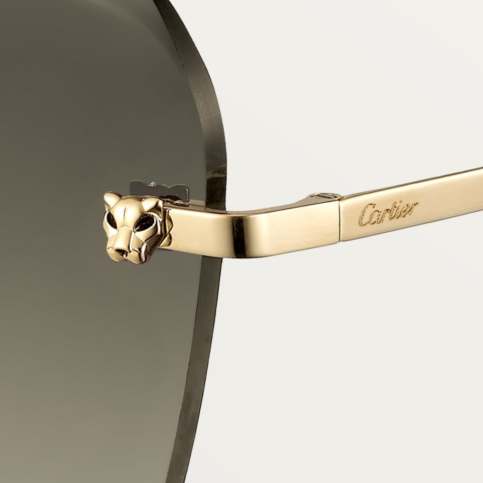Lunettes solaires Panthère de Cartier en métal finition dorée champagne lisse, têtes de panthère finition dorée champagne et taches en laque noire, forme carré, verres marron dégradés, protection solaire de classe 3. Dimensions : verres 61 mm, pont 15 mm, branches 145 mm.
