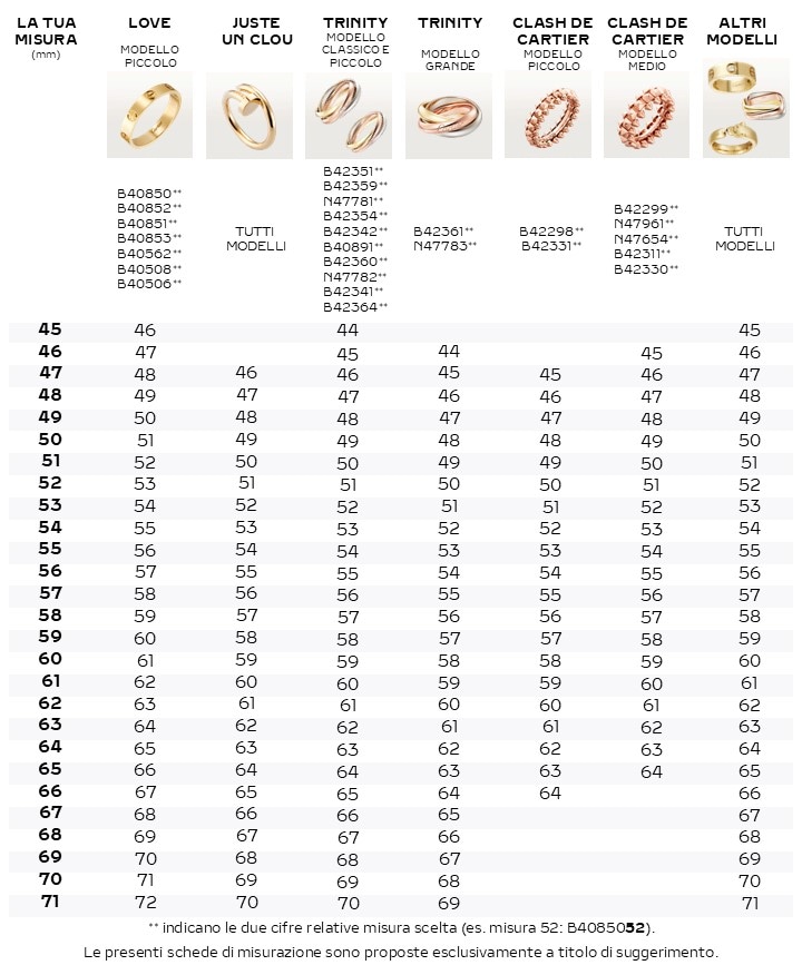 Le misure delle nostre creazioni variano a seconda della collezione. Consulta la tabella sottostante per ottenere una lista di tutti i nostri suggerimenti.