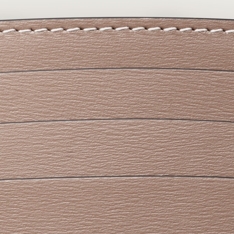 Portacarte di credito Panthère C de Cartier in pelle di vitello granulata color argilla, iconico logo Panthère finitura oro. Interno: pelle di agnello nera, un inserto grande centrale, 3 tasche per carte di credito sul retro, firma “Cartier” color oro impressa a caldo.