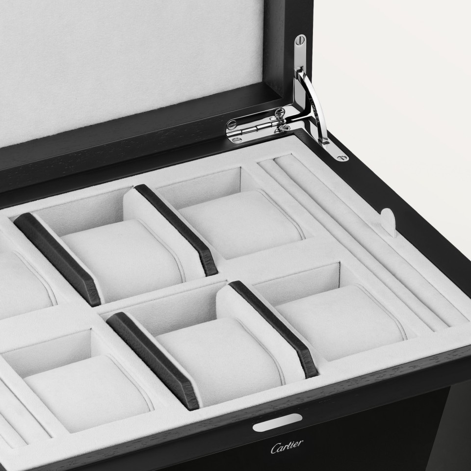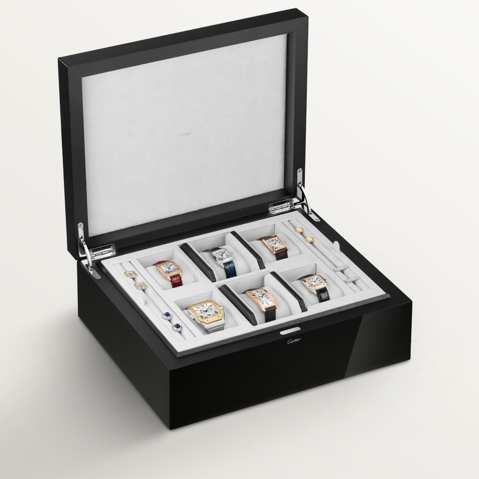 Cofanetto 6 orologi e gemelli Santos de Cartier in legno laccato nero, decoro e dettagli finitura palladio, interno in Alcantara®* grigia. Due pochette da viaggio in pelle di vitello granulata nera.