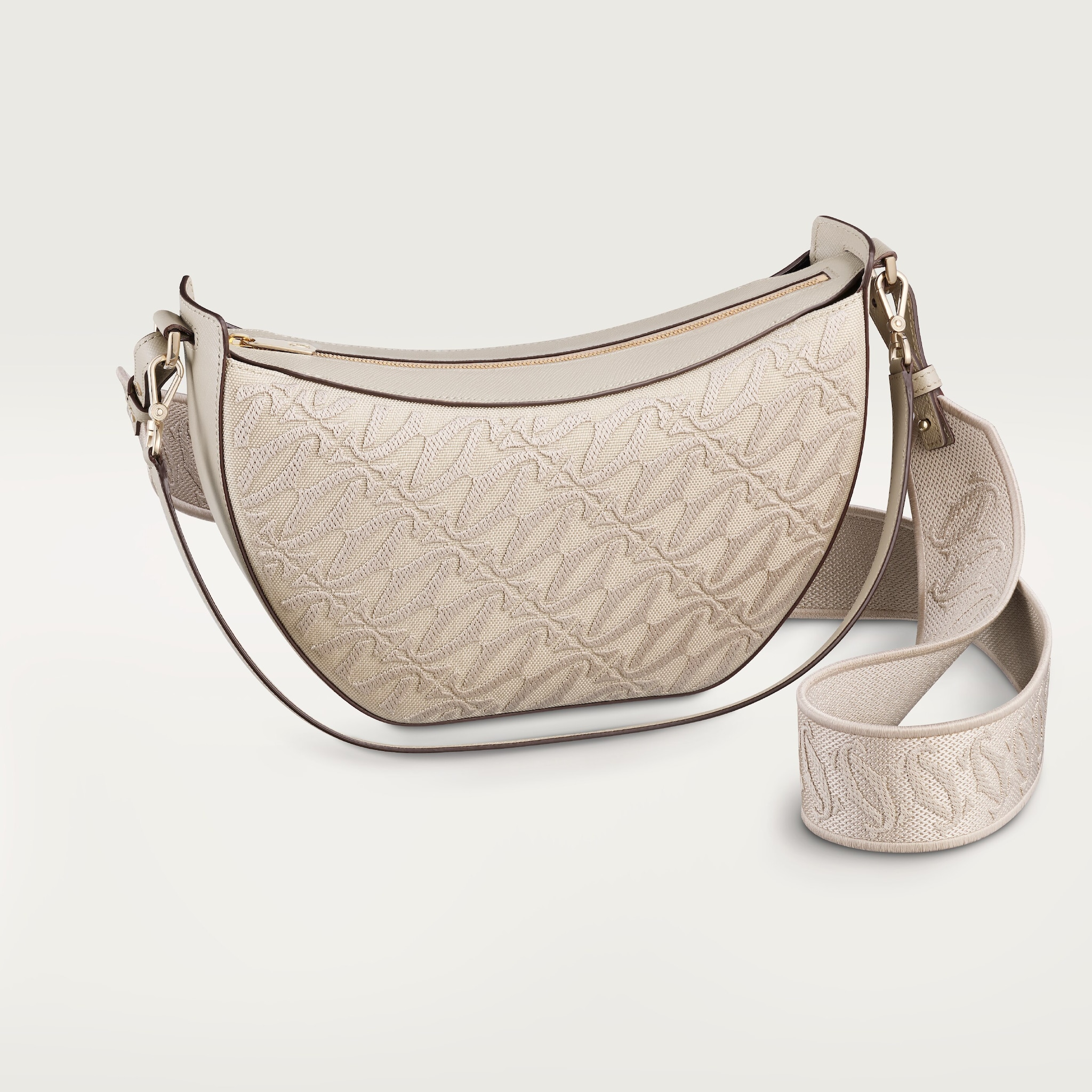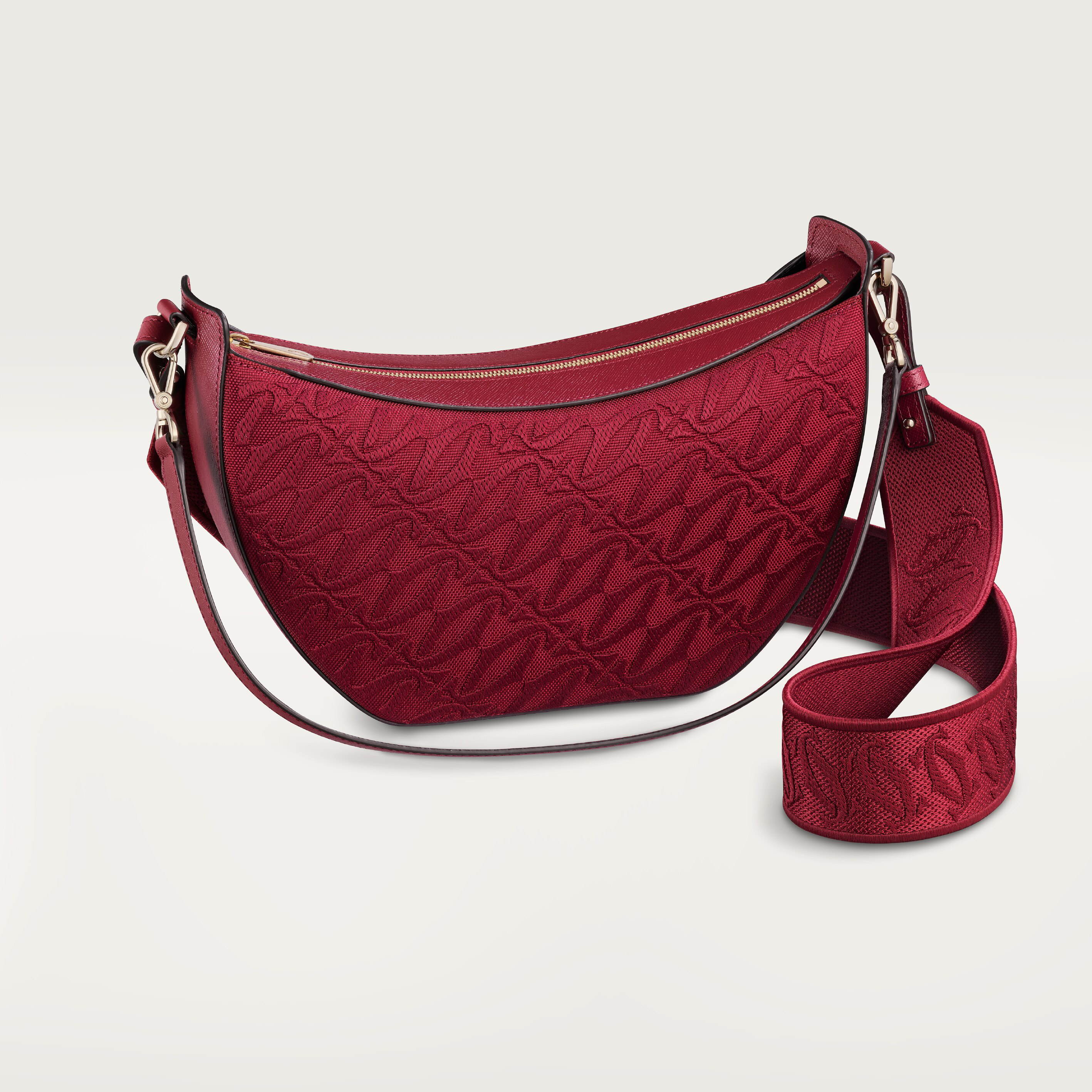 C 드 까르띠에 호보 백, 블랙 텍스처드 송아지 가죽, 골드 피니싱, 내부에 핫스탬핑된 골드 컬러 “Cartier” 시그니처. 내부 지퍼 수납 공간 1개. 안감: 블랙 양가죽. 조절 및 탈착 가능한 자수 숄더 스트랩, 탈착 가능한 블랙 텍스처드 송아지 가죽 핸들. 크기: 높이 180mm x 길이 260mm x 깊이 70mm. 숄더백 또는 크로스백으로 착용 가능.