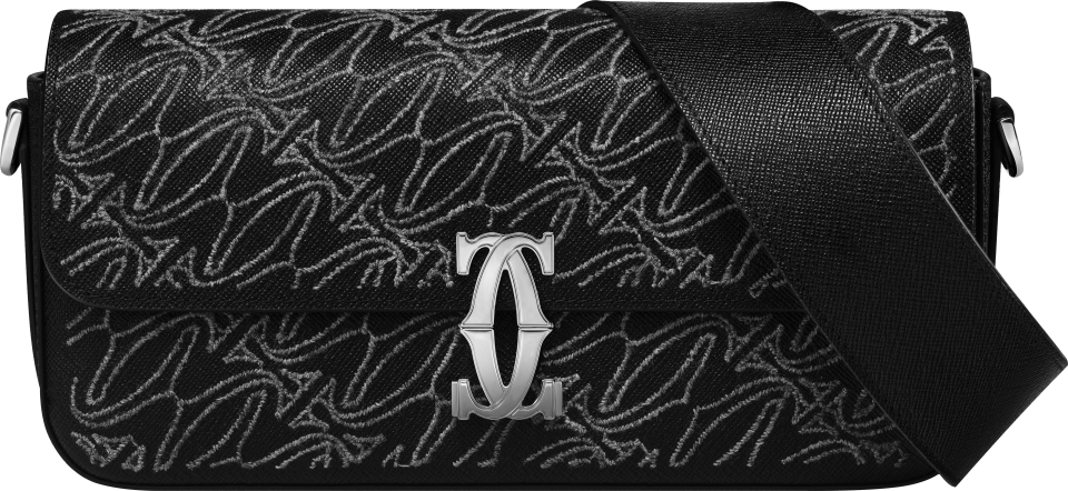C de Cartier East-West-tas van getextureerd zwart kalfsleder, wollen geborduurd Double C-motief, sluiting met palladium afwerking, zilverkleurig hot-stamped Cartier-logo aan de binnenkant. Eén binnenvak en één plat vak. Voering: zwart lamsleder. Afneembare en verstelbare schouderriem van getextureerd zwart kalfsleder en afneembaar handvat van getextureerd zwart kalfsleder. Afmetingen: Hoogte: 130 mm. Lengte: 250 mm. Diepte: 70 mm. Kan over de schouder en crossbody worden gedragen.