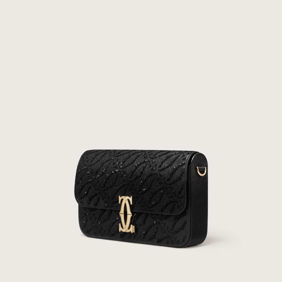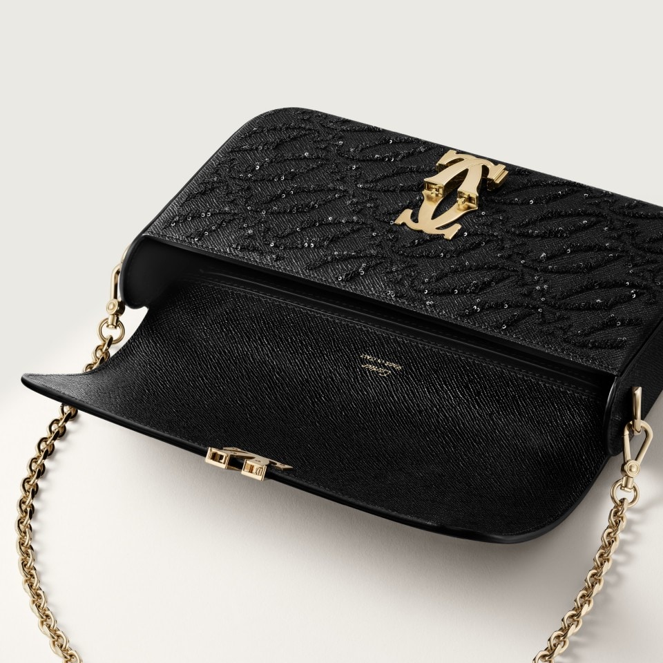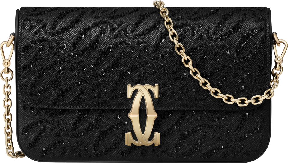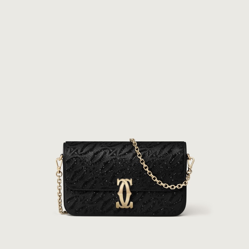 Minimodel tas met ketting, C de Cartier, zwart getextureerd kalfsleder met geborduurde zwarte pailletten. Gesp met goudkleurige afwerking, goudkleurig hot-stamped Cartier-logo aan de binnenkant. Eén binnenvak, vier kaartsleuven en één plat vak. Voering: zwart lamsleder. Afneembare ketting. Afmetingen: Hoogte: 120 mm. Lengte: 200 mm. Diepte: 35 mm. Kan over de schouder en crossbody worden gedragen.